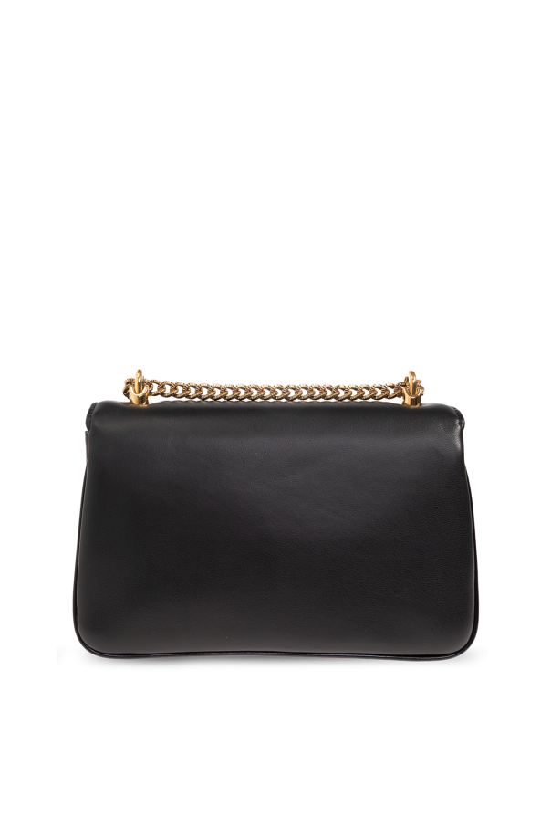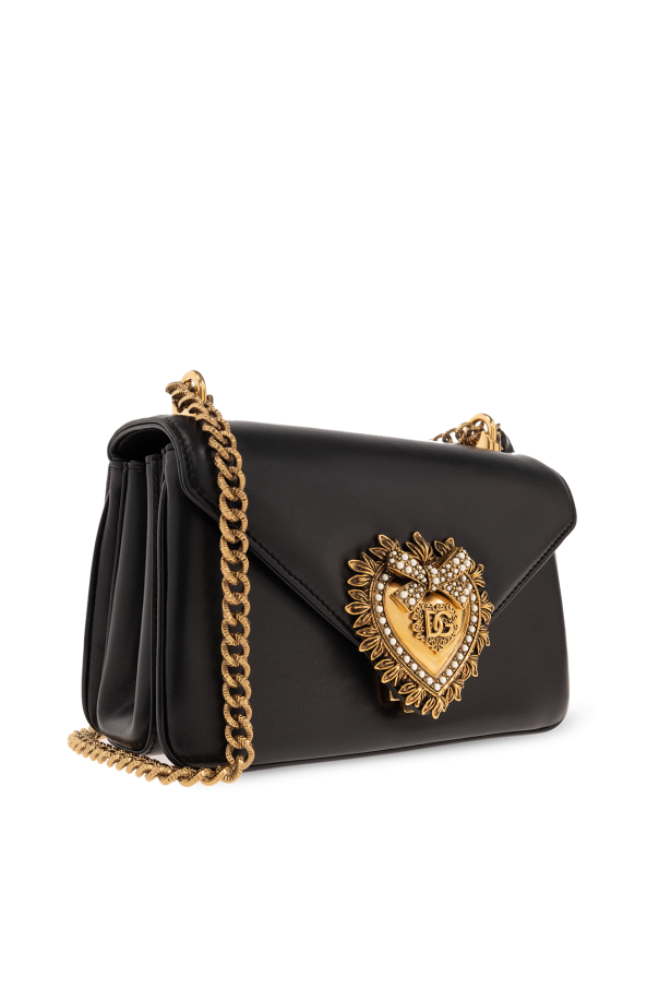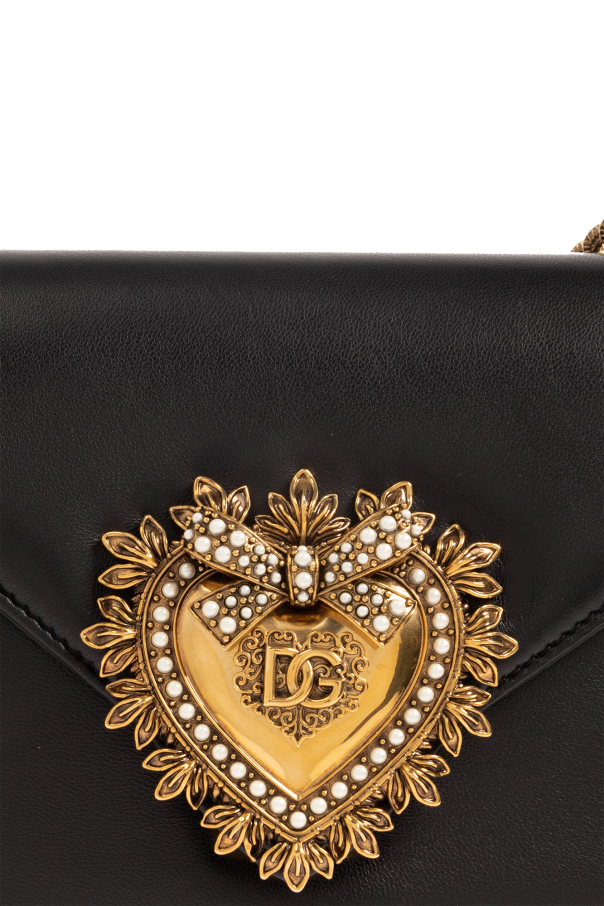 Black ‘Devotion’ shoulder bag from Dolce & Gabbana. Made of smooth lamb leather, this design fastens via a snap with a metal heart, faux pearls and engraved detailing and features a leather shoulder strap reinforced with a chain, antiqued gold-tone metal hardware as well as two slip pockets and one compartment with a zip pocket inside.