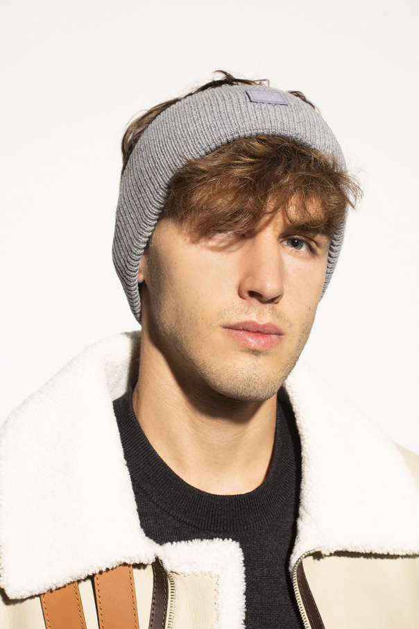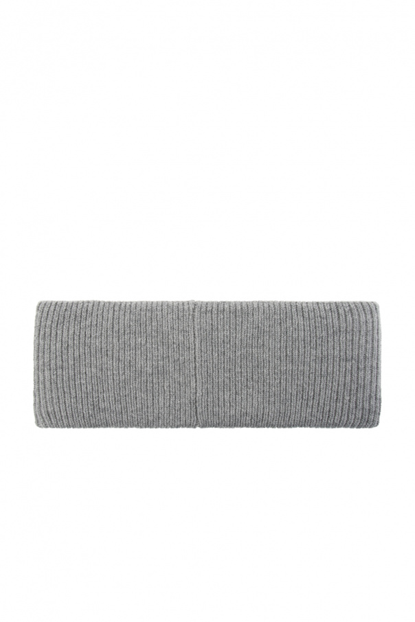 Grey headband from Acne Studios. Crafted from a ribbed wool knit, this item showcases a grey logo patch for brand recognition.
