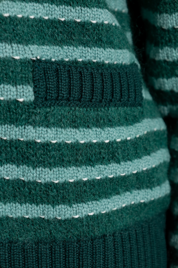 Green cardigan with a standing collar from Moncler. Crafted from a wool and mohair blend, this style showcases a down-filled back panel, a stripe pattern, logo patch, two-way zip and snap fastenings, two slip pockets and elasticized trims on the bottom hem and cuffs.