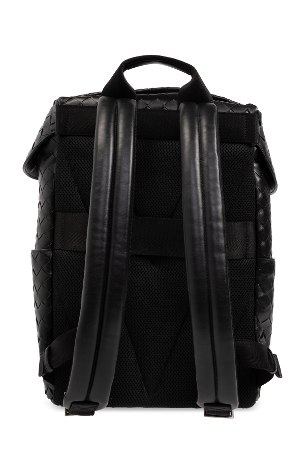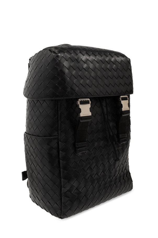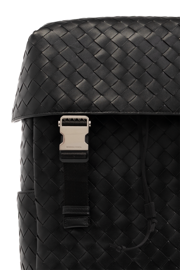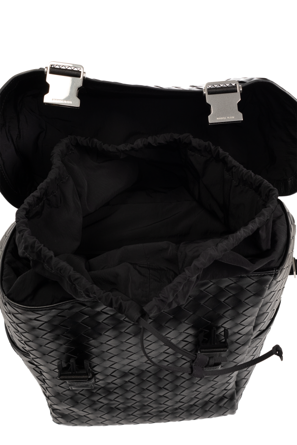 Black backpack from Bottega Veneta. Made of calf leather, this design cinches closed with drawstrings and showcases the brand\'s signature ‘Intrecciato’ weave, snap fastenings, slip pockets on the sides, one half-round handle, adjustable shoulder straps and one internal compartment with one zip pocket and one slip pocket.