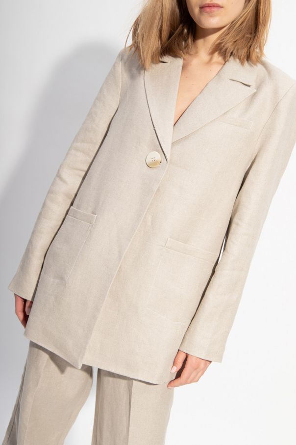 Beige blazer from Ganni. Crafted from linen, this style fastens via buttons and features peak lapels, three slip pockets, white stitching details and long sleeves with button cuffs.
