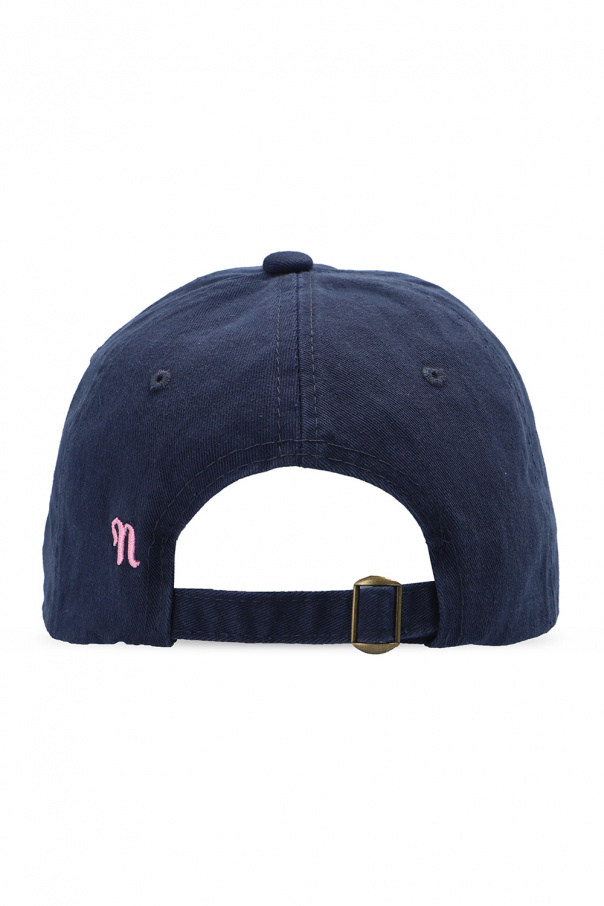 Navy ‘Val’ baseball cap from Nanushka. Made of organic cotton, this item is decorated with a pink logo embroidery.