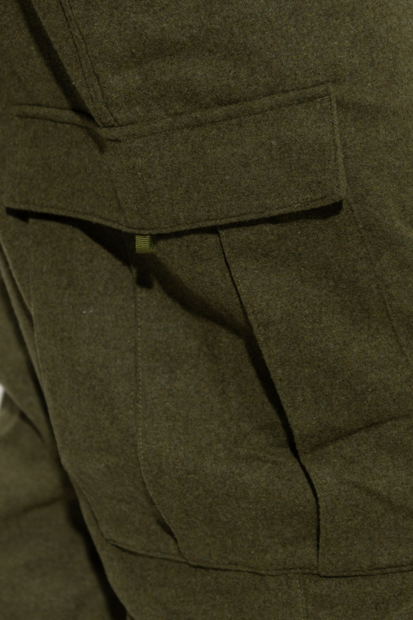 Green cargo trousers from Y-3 Yohji Yamamoto. Equipped with multiple pockets, this pair features a drawstring waist, a zip fly with buttons, elasticated cuffs and a printed logo at the back.