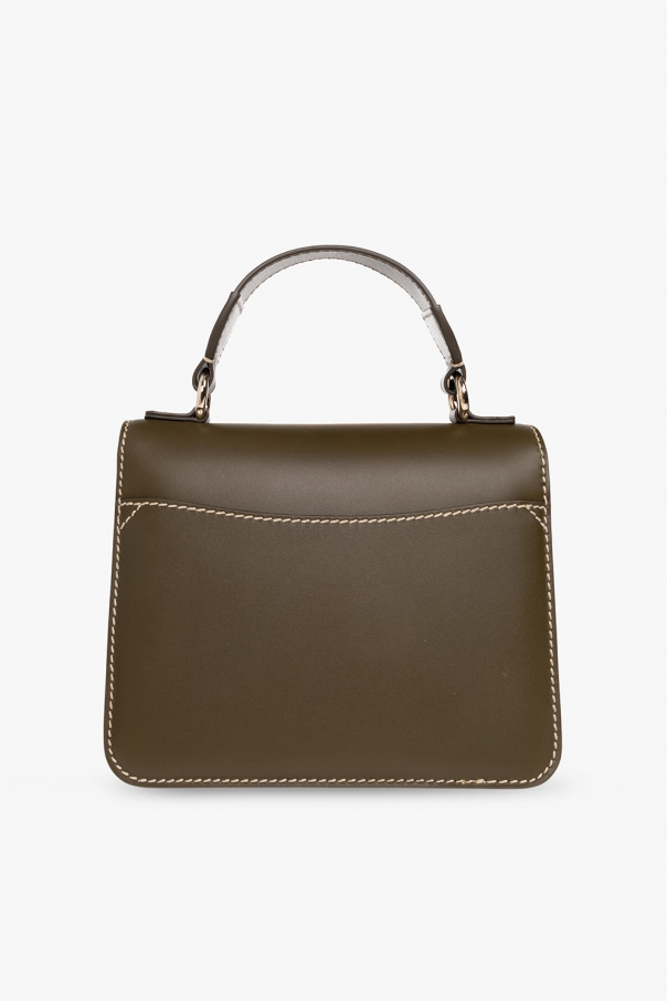 Khaki ‘Kattie Small’ shoulder bag from Chloé. Made of leather, this model fastens with a magnetic snap and is decorated with beige stitching, embossed logo and decorative triple handle made of woven leather, metal and wool. It is complete with a back pocket, half-round handle, detachable, adjustable shoulder strap, gold-tone metal hardware and one internal compartment with one slip pocket and one card slot.