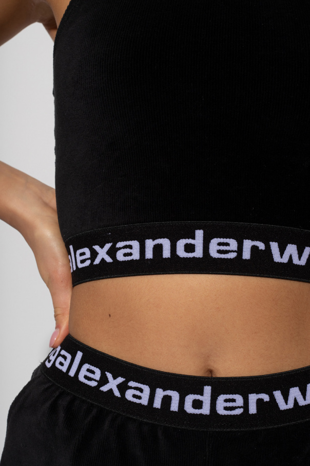 Black sleeveless crop top from Alexander Wang. This design features a funnel neck and an elastic tape with a white logo.