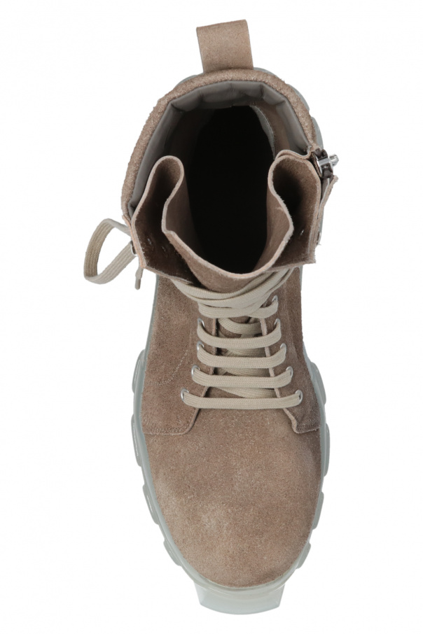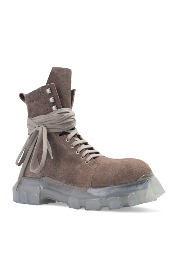 Brown ankle boots from Rick Owens. Crafted from suede, this lace-up model features a side zip fastening and a transparent rubber sole.