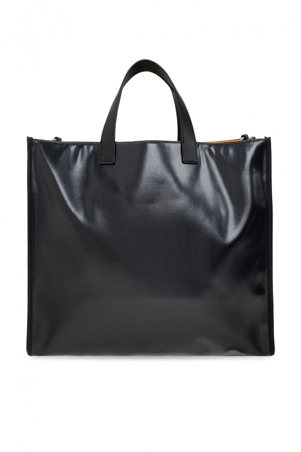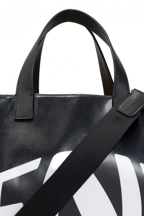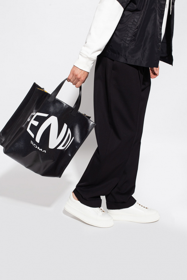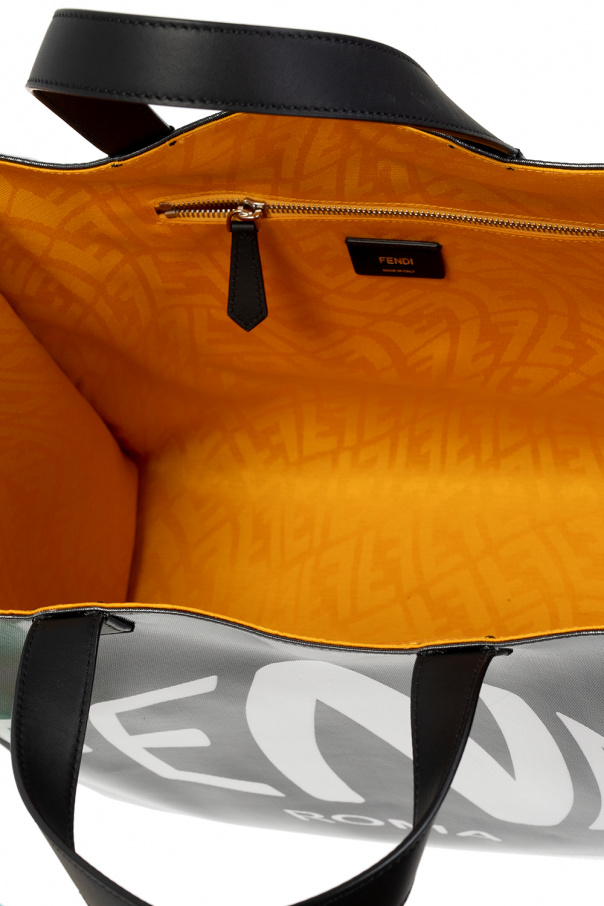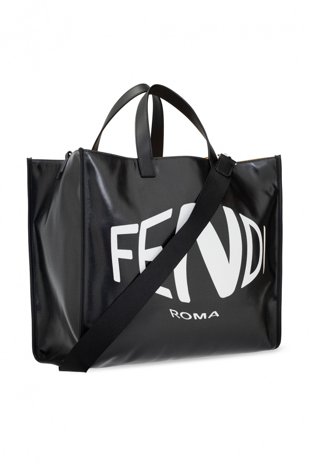 Black shopper bag from Fendi. Printed with the brand's logo, this design features two half-round handles, an adjustable shoulder strap, silver-tone metal hardware and a yellow-clad interior with one compartment and a zip pocket.