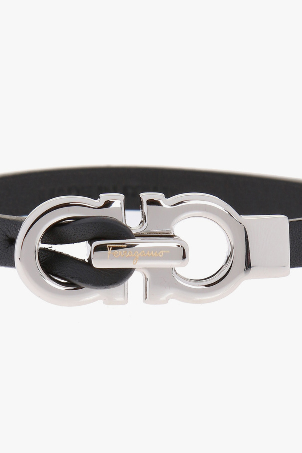 Black bracelet from FERRAGAMO. Made of smooth leather. Silver-tone brass closure in the shape of signature logo.