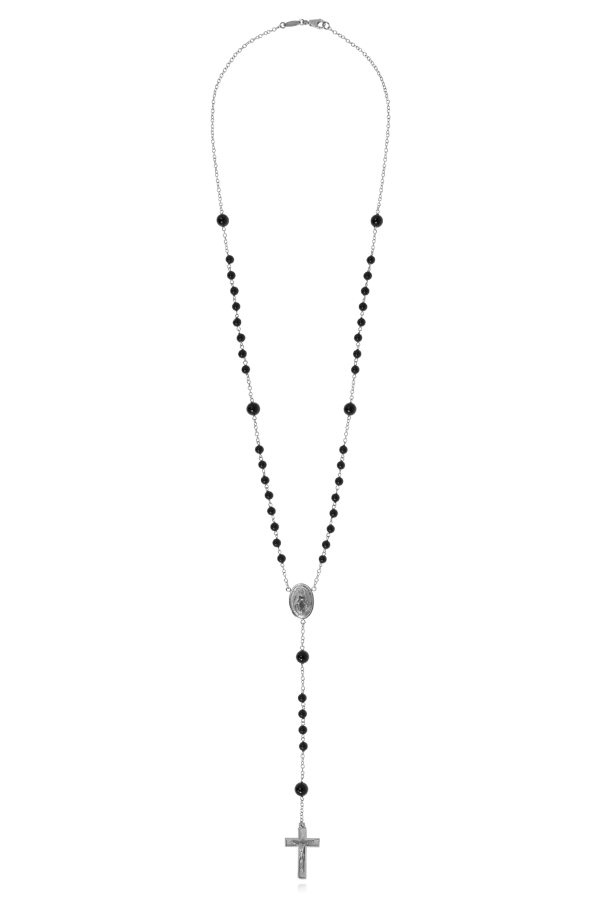 Introducing the Rosary-Style Necklace by the renowned designers Dolce & Gabbana, a masterpiece that epitomizes elegance and sophisticated craftsmanship. This luxurious necklace features a classic rosary structure, meticulously crafted from 18-karat yellow gold and adorned with 42 black jadeite beads, each handwoven with precision. The necklace measures an exquisite 61 cm in length, showcasing a central medallion depicting the Virgin Mary, with a delicately engraved reverse side. The medallion gracefully connects to a crucifix adorned with the figure of Christ, linked by six additional jadeite beads, adding a profound spiritual touch. Produced in Italy, this necklace combines the timeless allure of jade and gold with the contemporary elegance that is the hallmark of Dolce & Gabbana. The lobster clasp closure ensures ease of wear, making it a perfect accessory for the discerning gentleman. Why Choose This Product? Exquisite craftsmanship with handwoven jadeite beads. Elegant design with a spiritual essence. Made from luxurious 18-karat yellow gold. A signature piece by Dolce & Gabbana. Manufactured in Italy, ensuring premium quality.