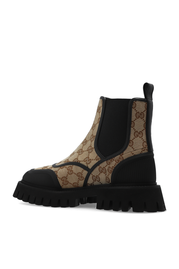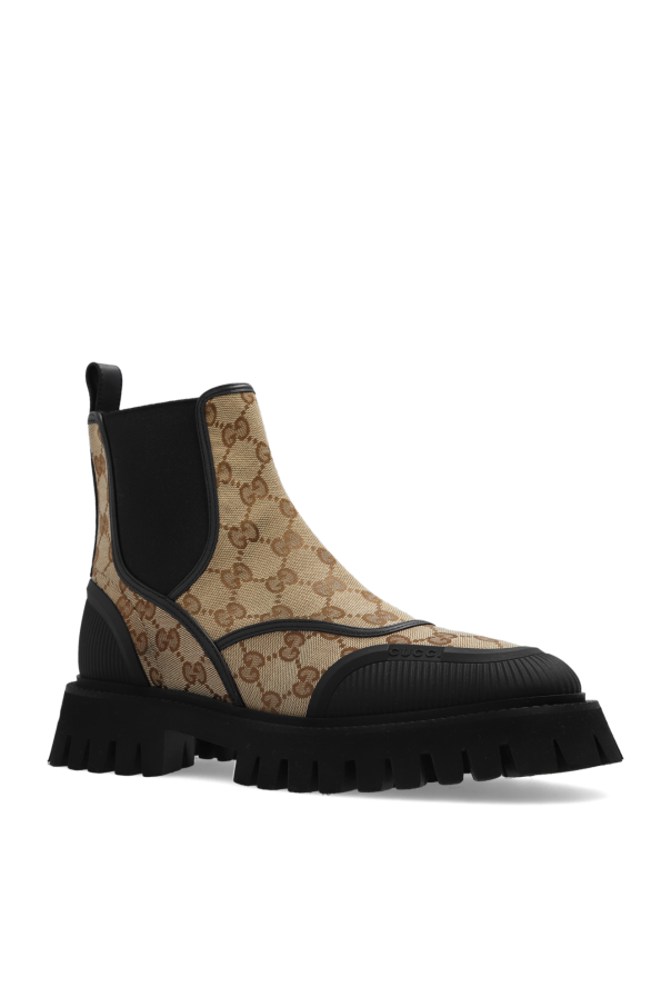 Beige, brown and black Chelsea boots from Gucci. Made of ‘GG Supreme’ canvas, this model sits on a chunky black rubber sole and features elastic panels on the sides, leather trims and rubber inserts.
