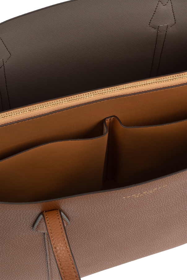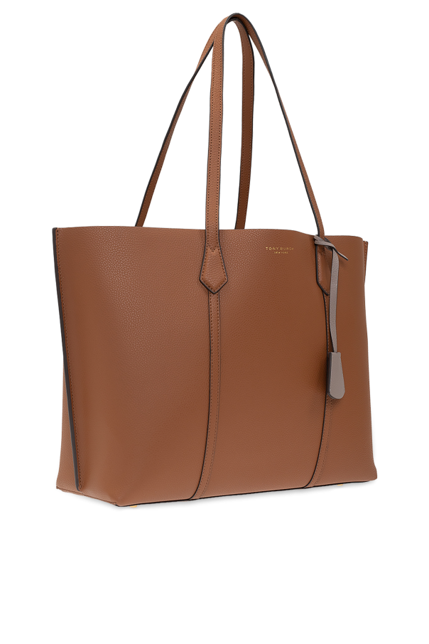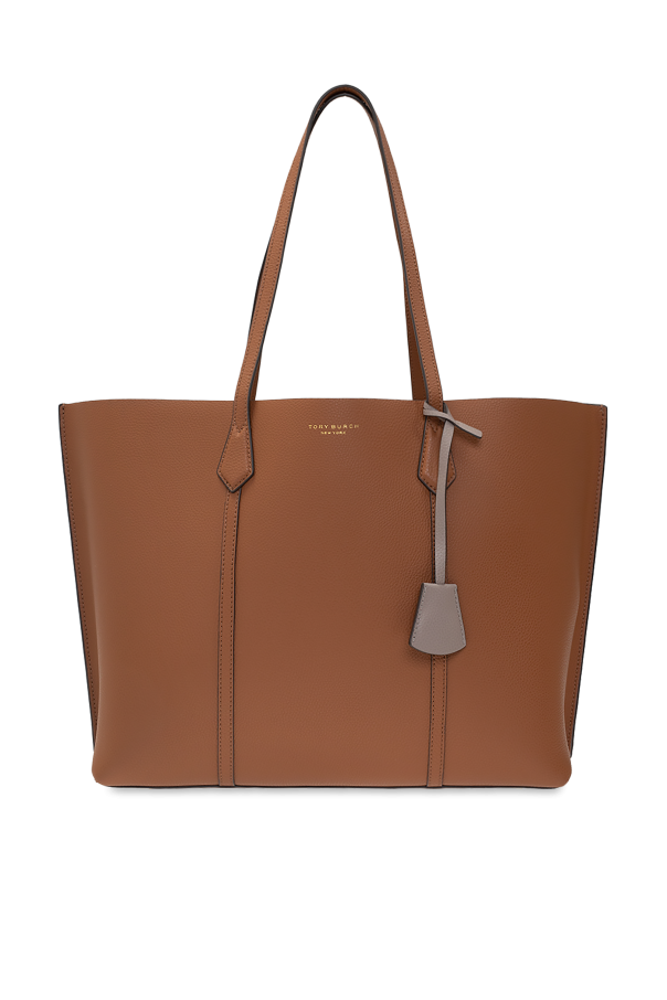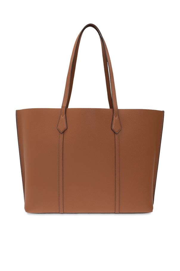 Brown \'Perry Triple Compartment\' shopper bag from Tory Burch. Crafted from grainy leather, this design showcases the brand\'s logo in gold-tone. It is complete with two half-round handles, gold-tone metal hardware, an attached grey leather charm with a logo plaque and a grey and orange-clad interior with two compartments, three slip pockets and one zip pocket.