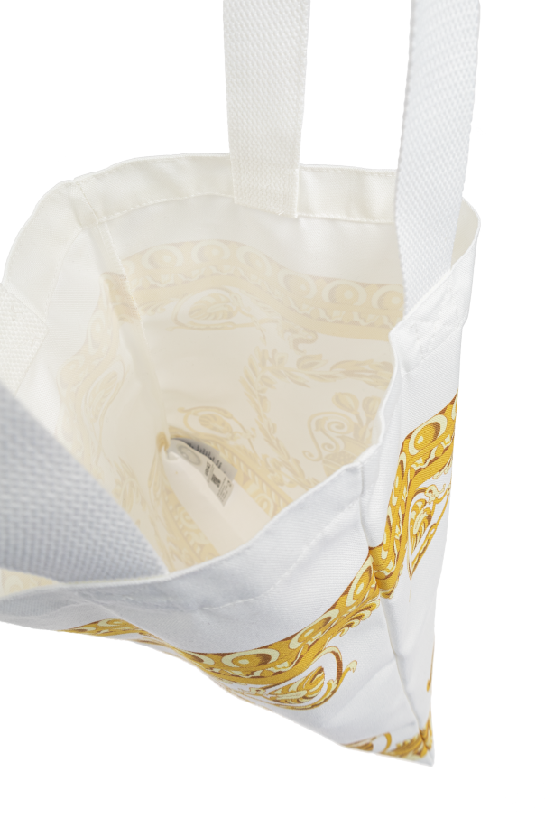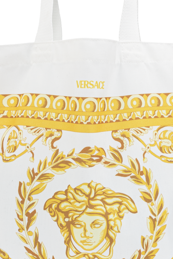 Introducing the Shopper Bag from the exclusive Versace Kids collection, a sublime fusion of luxury design and practical elegance. Crafted with a rectangular shape and long handles, this bag is the epitome of convenience, allowing effortless shoulder wear. Adorned with resplendent golden accents, the bag features classic Greek motifs, prominently showcasing a laurel-crowned face. The striking contrast between its white canvas-like backdrop and intricate golden patterns renders it a visual masterpiece. The interior is equally exquisite, decorated with delicate designs that elevate its elegance. Topped with the iconic Versace logo in gold, this bag is a testament to opulence and style. Why Purchase This Product? Perfect blend of functionality and high fashion. Ideal for everyday use or as a chic accessory. Part of the prestigious Versace Kids collection, embodying timeless charm.