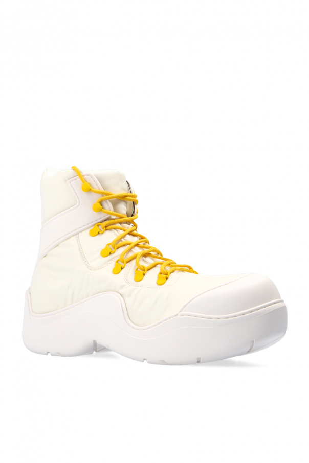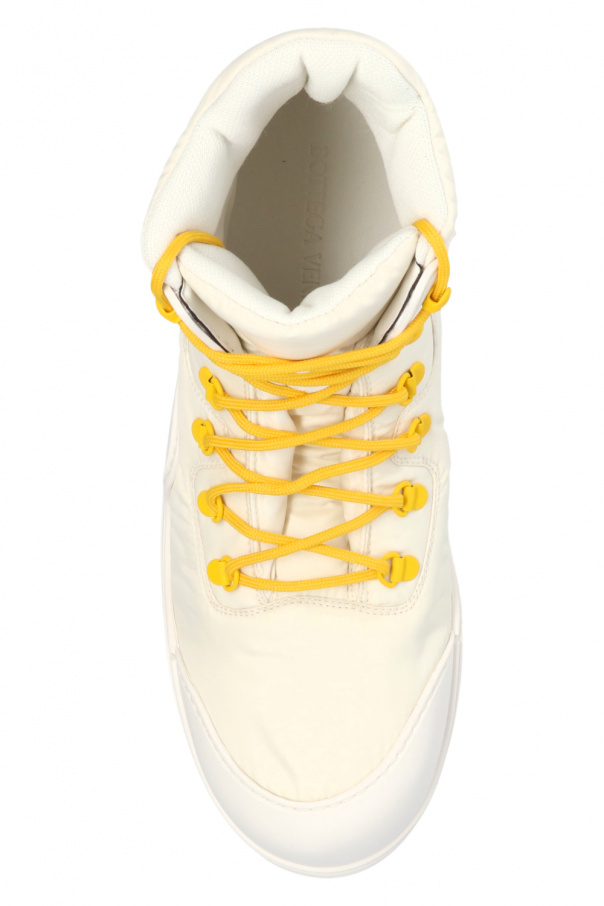 White platform shoes from Bottega Veneta. Finished with rubber, this lace-up model sits on a white rubber sole and features yellow shoelaces.