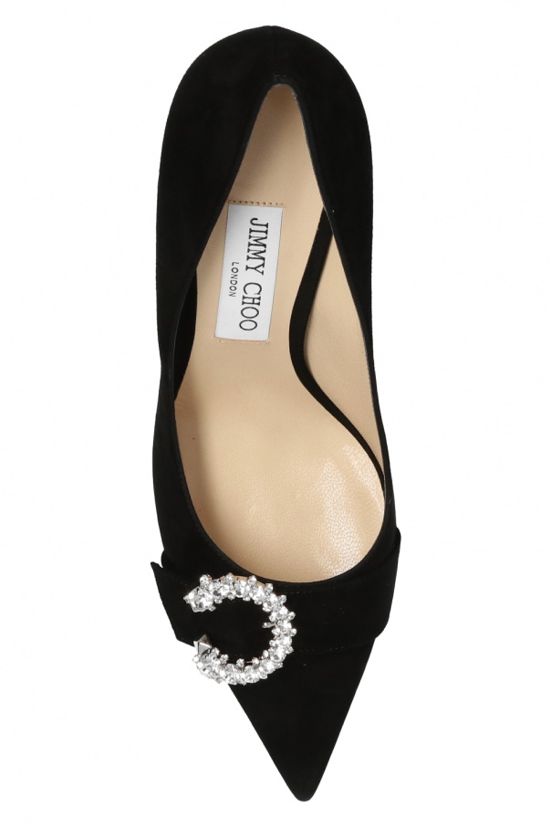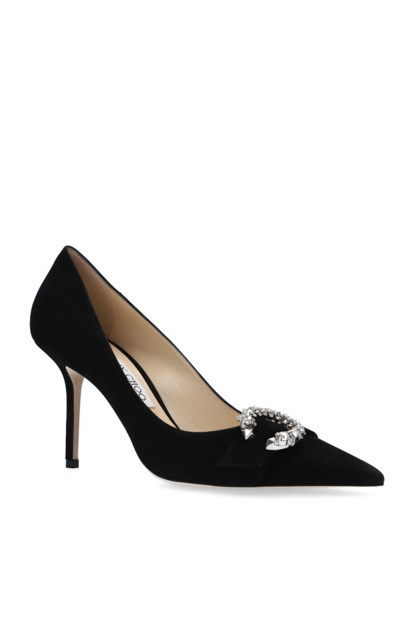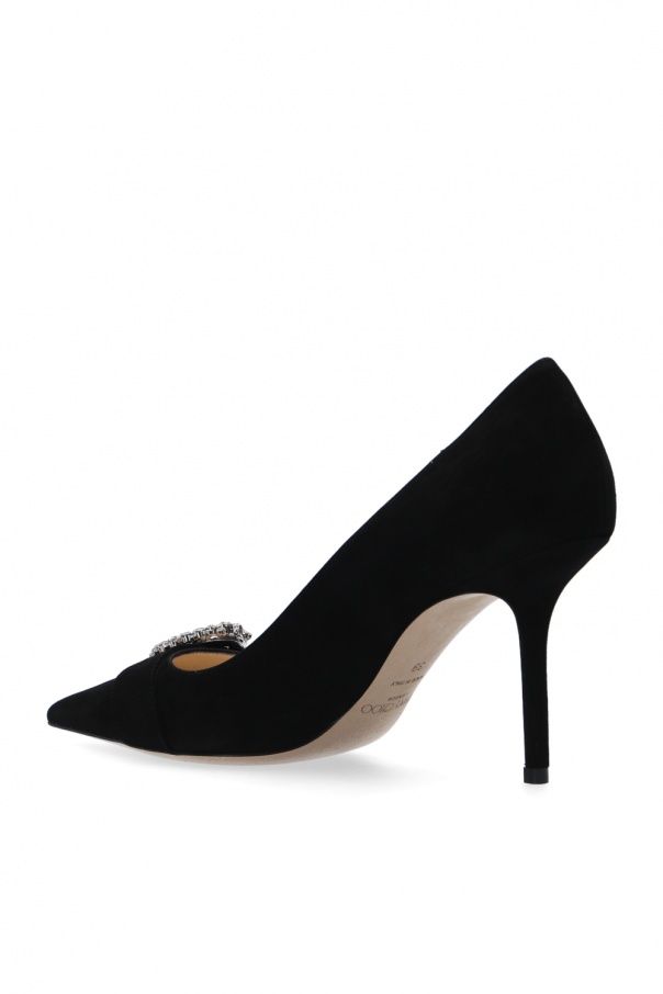 Black ‘Saresa’ stiletto pumps from Jimmy Choo. Crafted from suede, this pair is set on a beige leather sole and showcases pointed toe and silver-tone crystal-bejewelled frontal buckle strap for a sumptuous look.