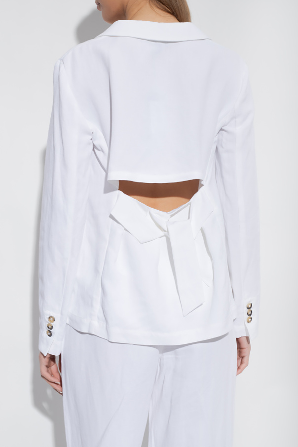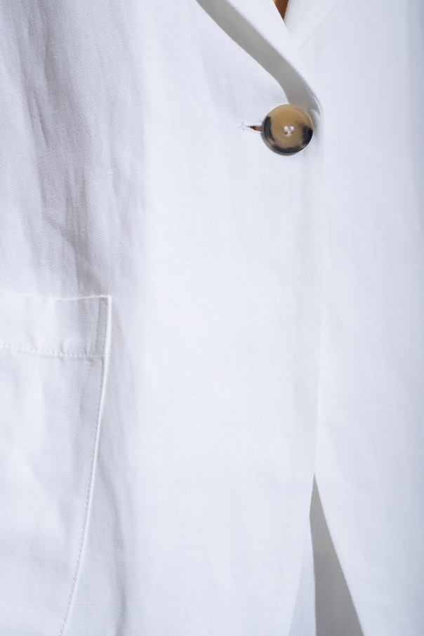 White single-breasted blazer from Emporio Armani. Crafted from a linen blend, this style fastens with a button and features two slip pockets, long sleeves with button cuffs and a back vent accompanied with a tie detail.