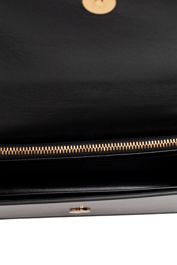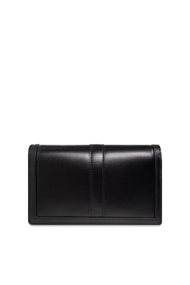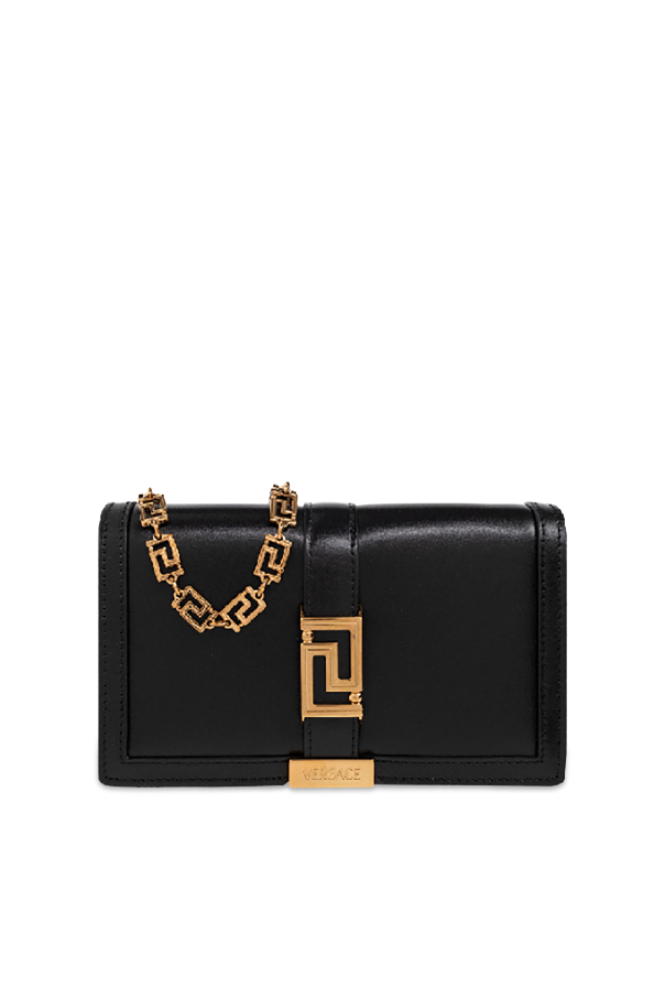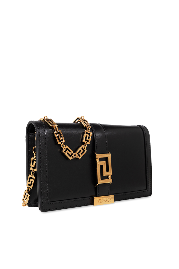 Black ‘Greca Goddess Mini’ shoulder bag from Versace. Crafted from calf leather, this design secures with a snap and showcases logo-engraved metal hardware with a Greek pattern on the front, a detachable chain strap with distinctive ‘Greca’ links, gold-tone metal elements and one internal compartment with four slip pockets, one zip pocket and eight card slots.