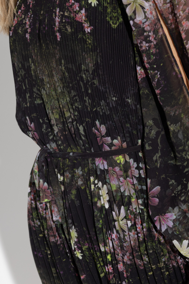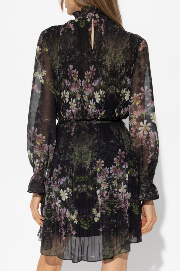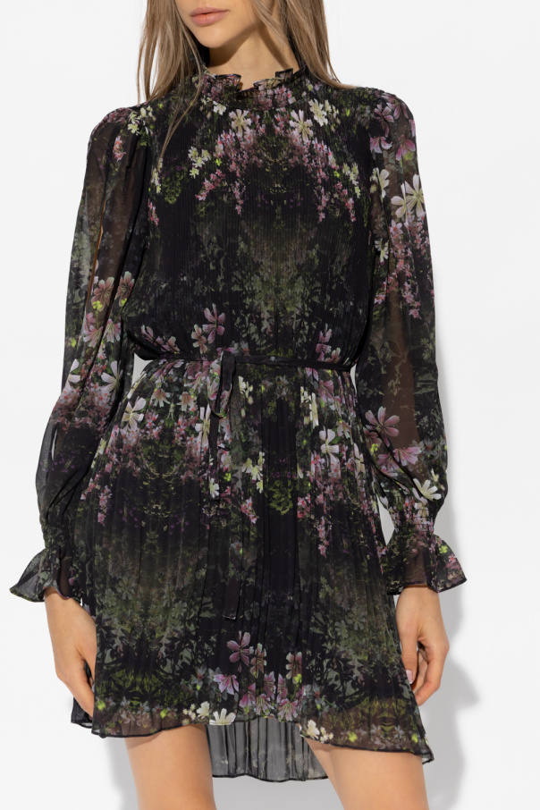 Black ‘Cora Ophelia’ pleated dress from AllSaints. Made of transparent recycled fabric, this design features button fastenings, tie waist belt, multicolored floral pattern, stand collar and long, puff sleeves with slits and ruffles.