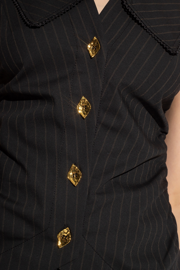 Black waistcoat from Ganni. Crafted in part from recycled materials, this design features gold-tone buttons, ruching on the sides, pinstripe pattern and decorative collar.