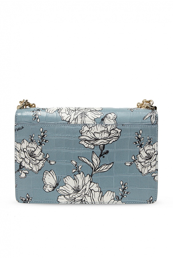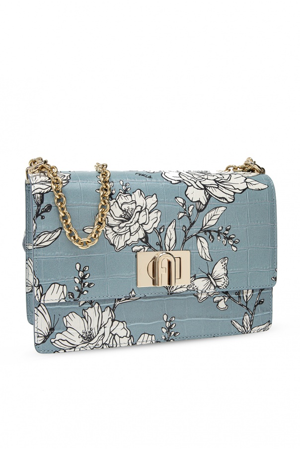Blue ‘1927’ shoulder bag from Furla. Crafted from textured leather, this item features a decorative logo closure, white and black floral print, slip pocket at the back, chain shoulder strap and one internal compartment with one zip pocket and one slip pocket.