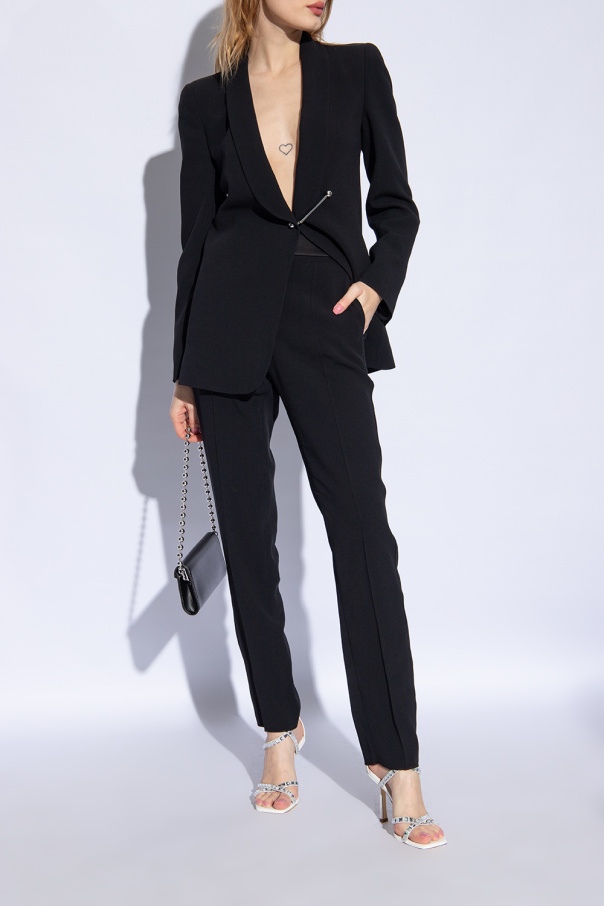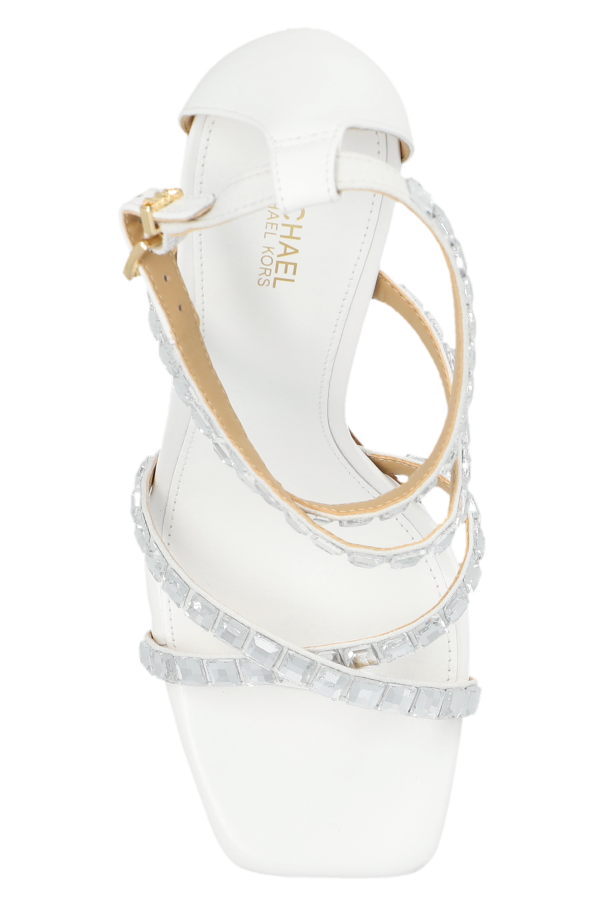 White heeled sandals from Michael Michael Kors. Made of leather, this pair features an ankle strap, glass inserts and beige rubber sole.