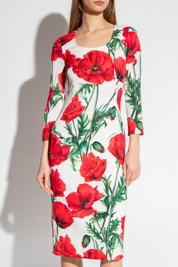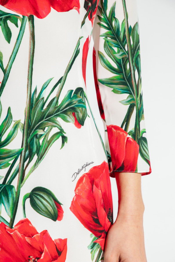 White dress from Dolce & Gabbana. Crafted from silk, this design features a concealed back zip and hook, red, green and black floral pattern, round neck and long sleeves.