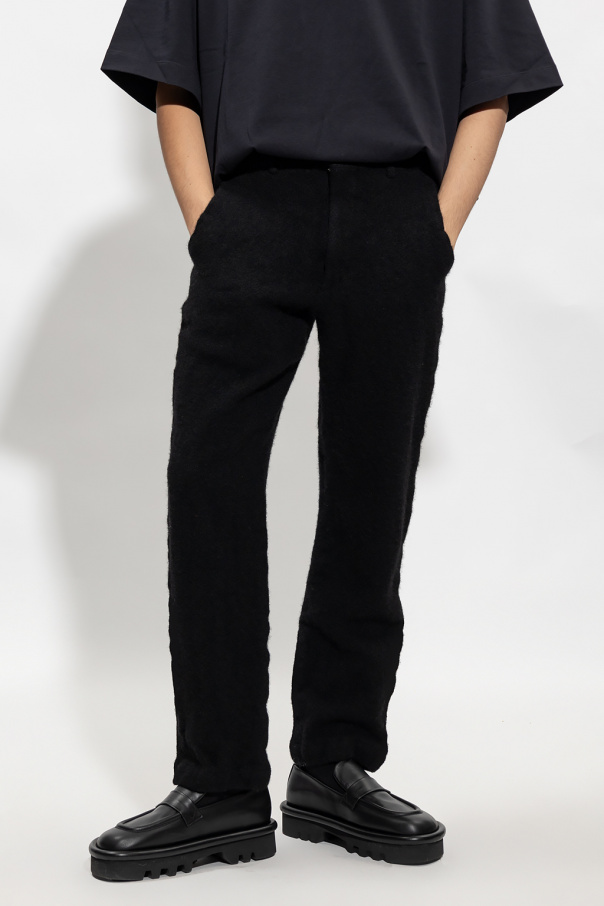 Black trousers from Comme des Garcons Homme Plus. Crafted from wool, this pair features a zip fly with a button, two slip pockets on the front and one slip pocket and one flapped pocket with a button at the back.