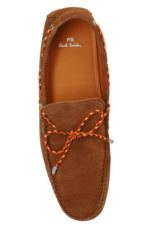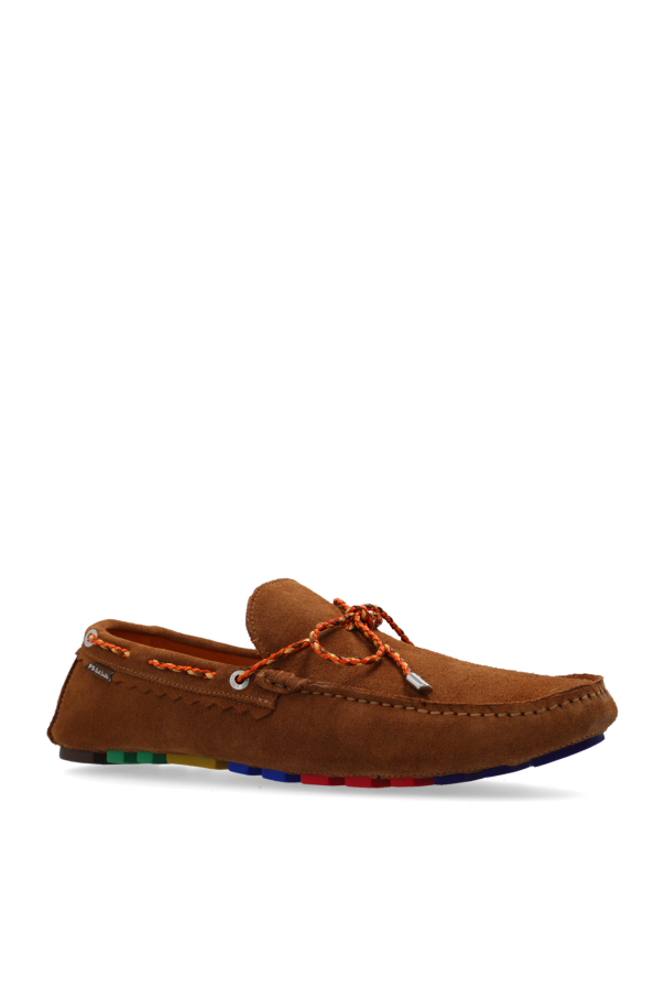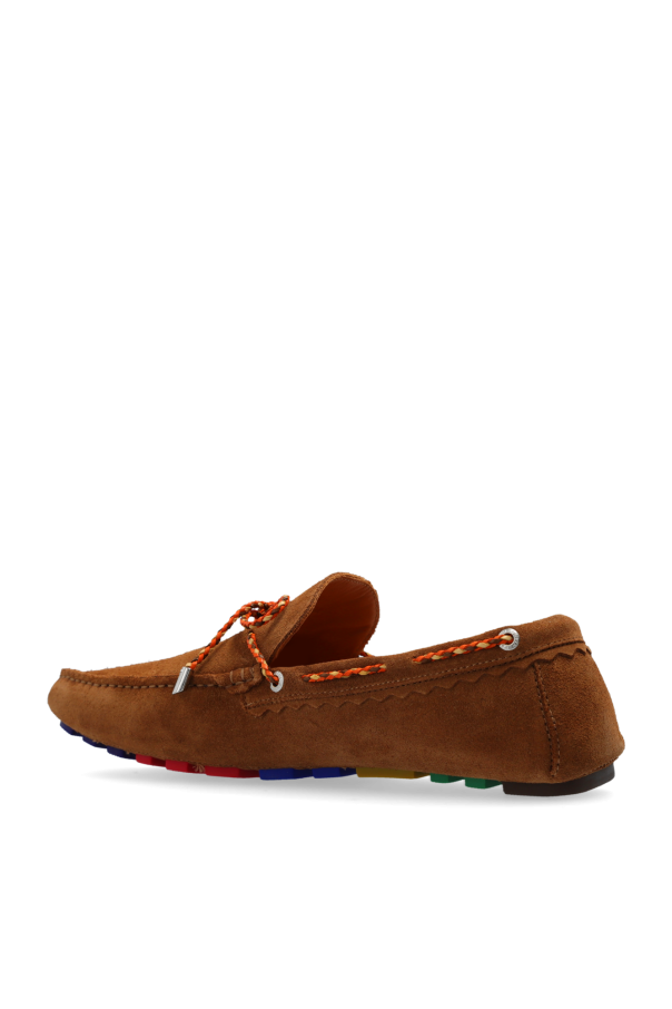 Brown ‘Springfield’ moccasins from Paul Smith. Made from suede, this model sits on a multicoloured rubber sole and features a logo patch on the side and colourful 360° string fastening.