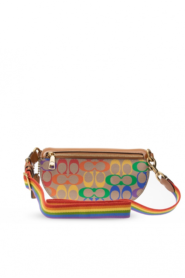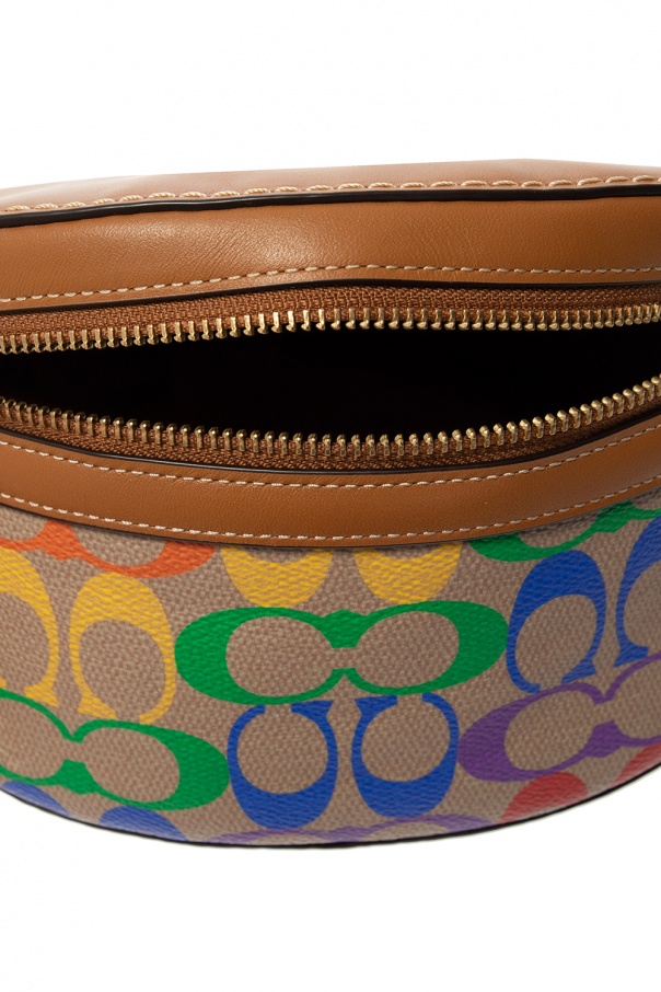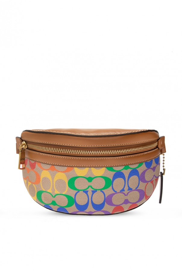 Light brown shoulder bag from Coach. Crafted from leather, it fastens with a zip and comes decorated with colorful printed pattern and a logo patch. It is complete with a zip pocket at the back, an adjustable shoulder strap, one internal compartment and antiqued gold-tone metal hardware.