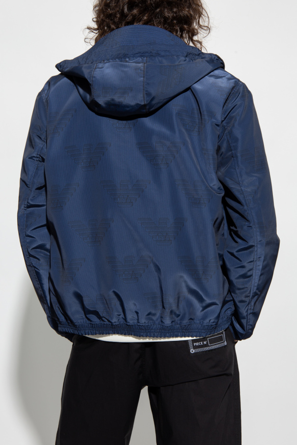 Navy jacket from Emporio Armani. Fastened with a two-way zip, this long sleeve design features a logo pattern, drawstring hood, two zip pockets and ribbed trims at the hem and cuffs.