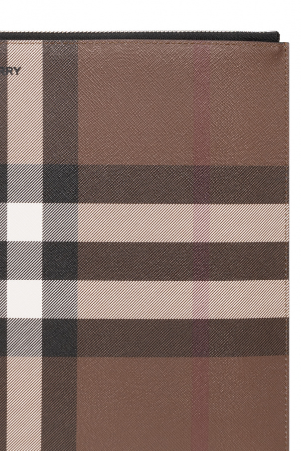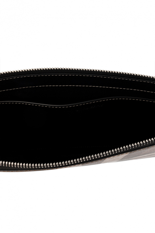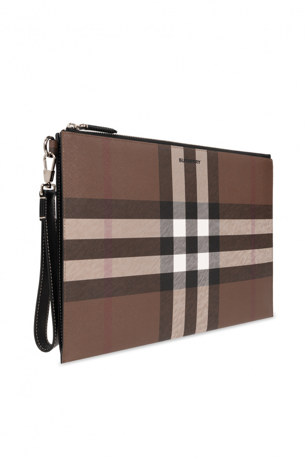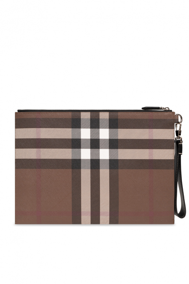 Brown ‘Edin’ pouch from Burberry. Embellished with the brand's signature check pattern in white, black and maroon, this style features a zip fastening, a logo print on the front, a detachable wrist strap, silver-tone metal hardware and one internal compartment with a slip pocket.