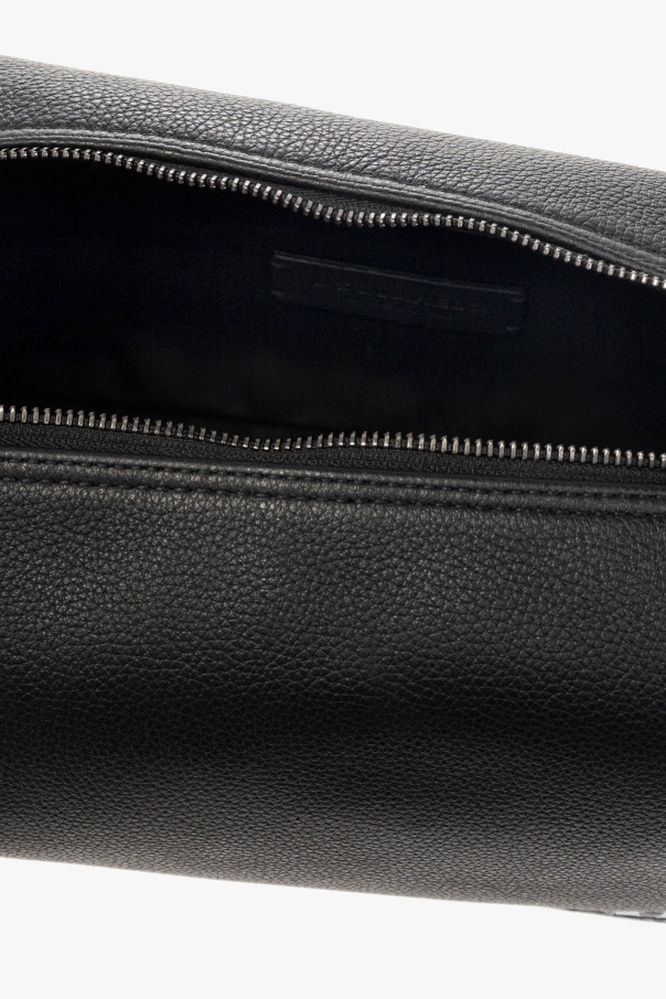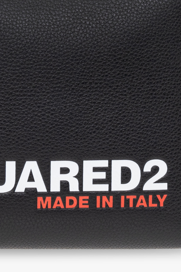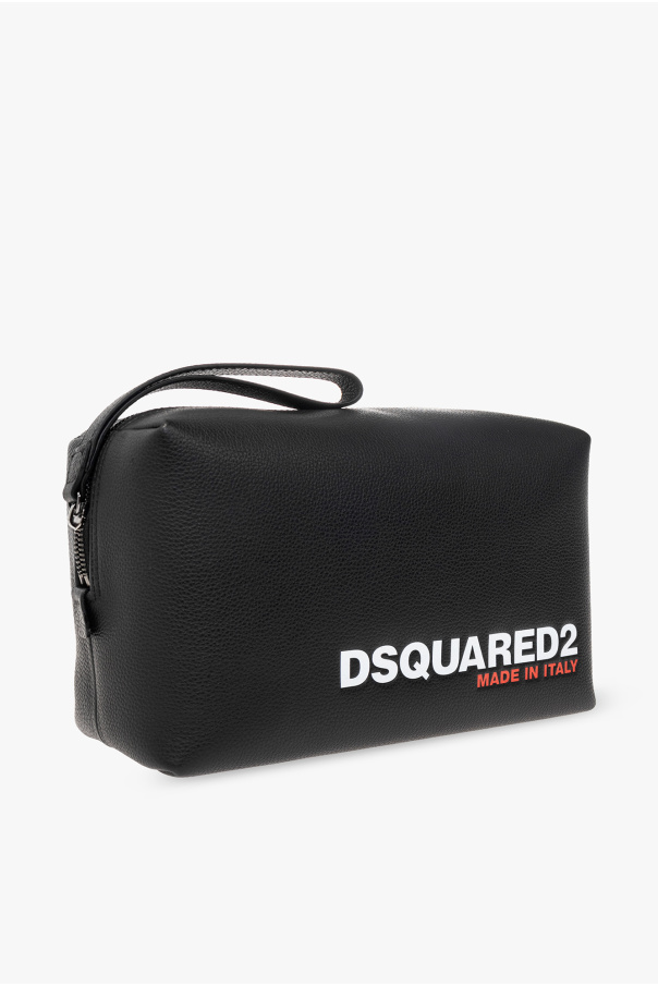 Black wash bag from Dsquared2. Made of leather, this model is complete with a zip fastening, printed logo pattern in white and red, wrist strap, dark silver-tone metal hardware and one internal compartment with one slip pocket.