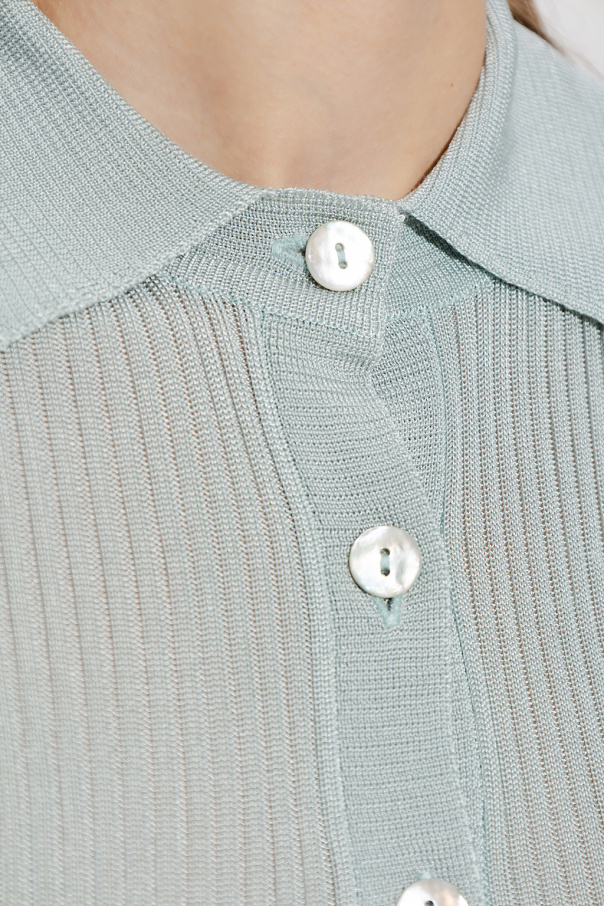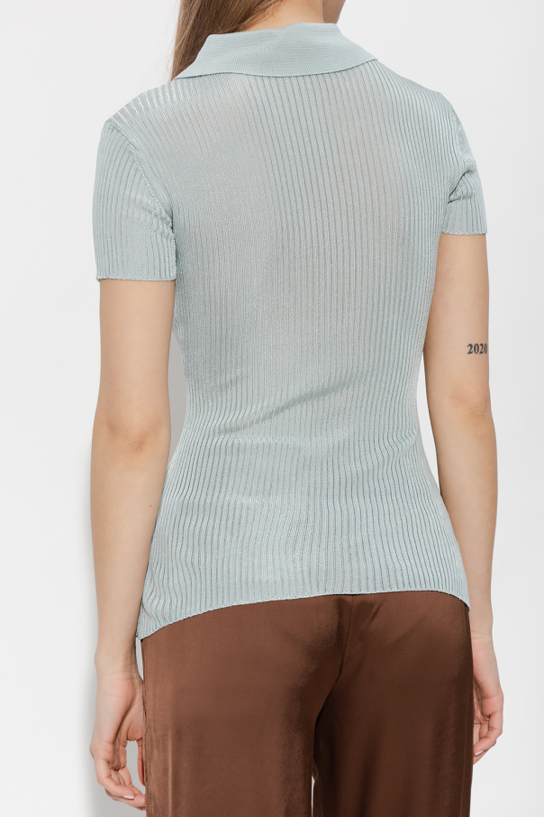 Light blue ‘Tate’ polo shirt from Aeron. Crafted from ribbed material with the FSC certificate, this style features a form-fitting silhouette, a collar with a button placket, and short sleeves.
