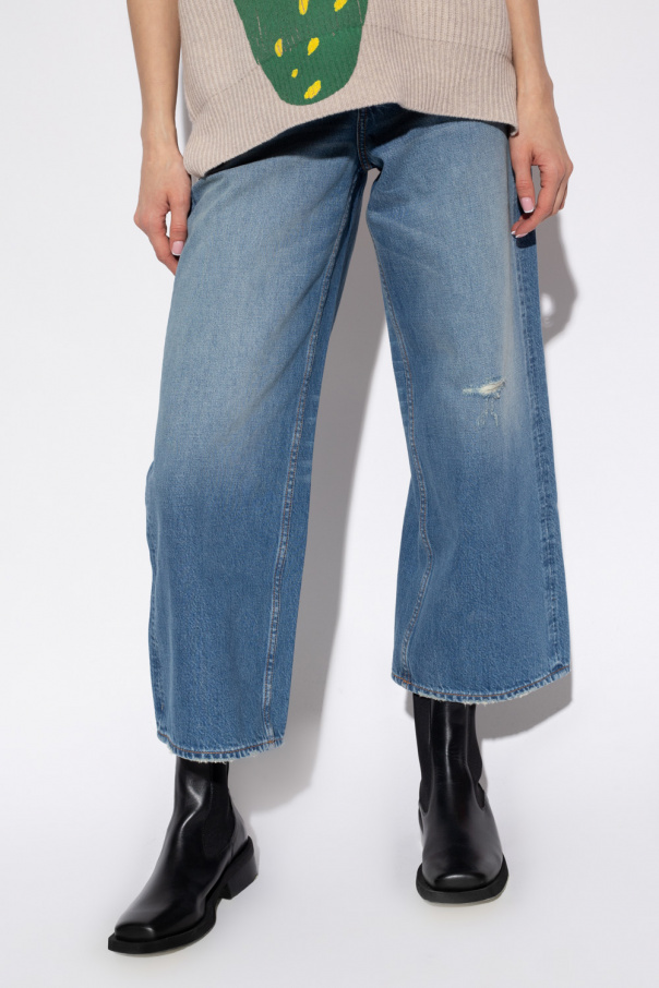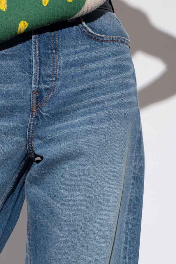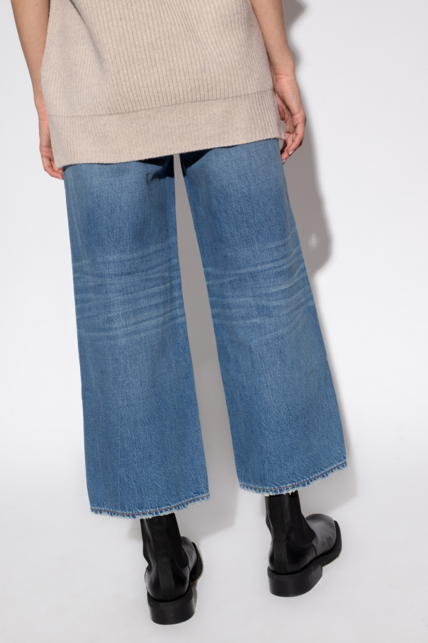 Blue distressed high-waisted jeans from Rag & Bone. Fastened with buttons, this pair features a logo embroidery at the back, three front pockets, two back pockets and flared legs.