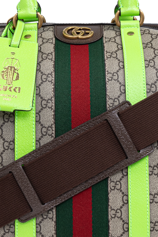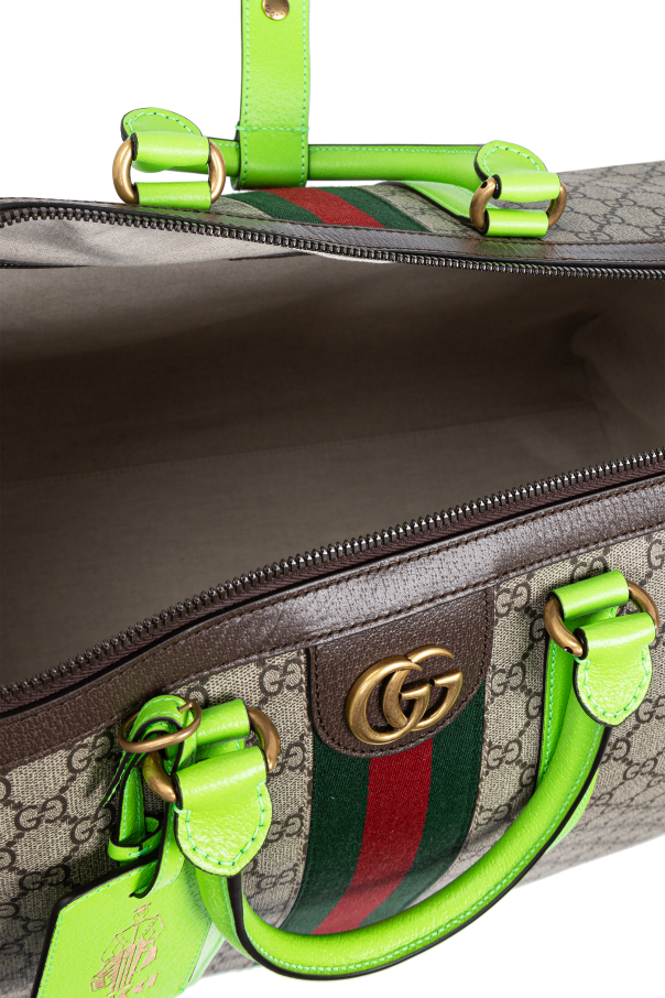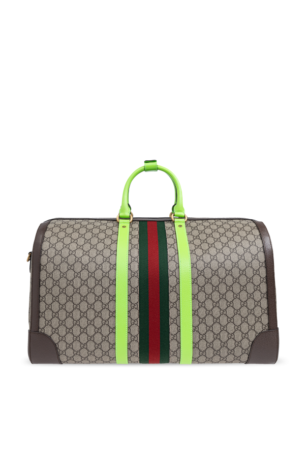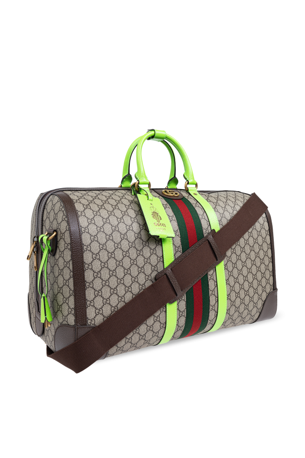 Introducing the Savoy Large travel bag by Gucci, an epitome of luxury and functionality. This piece, with its distinctive suitcase-like silhouette, exudes sophistication through its straight lines and flat bottom that allows it to stand upright. Crafted from the finest calfskin leather and \'GG Supreme\' canvas, it showcases the brand\'s iconic monogram pattern set against a beige and brown palette. The bag’s allure is further enhanced by the striking contrast of neon-green handles, brand tag, and zipper edges, complemented by green and red stripes running down its center. The gold-toned brand logo adorning the front adds a touch of elegance, while brown reinforcements on corners and edges signify durability. It features a spacious main compartment with a double-sided zipper, lined with a durable material interior, including two zippered pockets for organization. The Savoy Large also boasts an adjustable brown shoulder strap with metal clasps for versatile carrying options. Distinctive details such as the detachable key holder, custom \'Liftboy\' tag, and neon accents make this bag a unique accessory for the discerning traveler. Why Purchase This Product? Unparalleled craftsmanship from Gucci, blending luxury with practical design. Exclusive \'GG Supreme\' canvas and calfskin leather materials, offering durability and style. Adjustable and detachable shoulder strap for customized comfort and multiple carrying options. Internal organization features, including two zippered pockets and a detachable key holder, ensure your essentials are always within reach. Vivid color contrasts and refined metallic accents underscore its unique aesthetic, making it a standout piece.