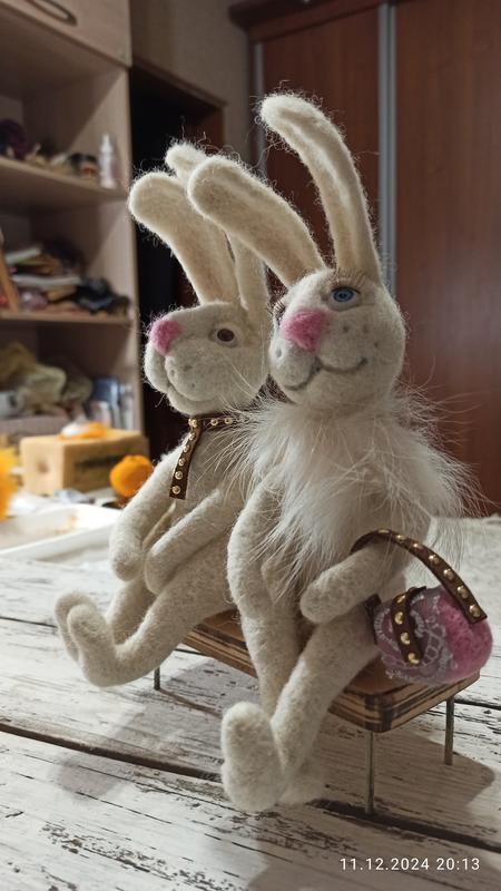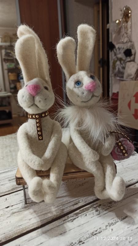 Продано.Можу сделать на щумирование.Интерьерные фигурки зайцев сделаны вручную из шерсти, в технике сухого валивания.Размер зайцы в седалищем положении 22 см.