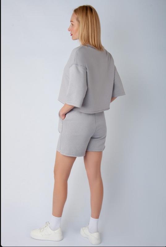 Стильна новинка - це жіночий комплект, який складається з укороченої футболки та шортів. Модель має декоративні вивернуті шви та імітацію необроблених країв. Футболка зі спущеним та подовженим рукавом, чудово поєднується з шортами на високій посадці, які мають широку резинку та шнурок. Комплект виготовлено з якісного полотна «Тринитка петля діагональ», має гарну фактуру та високу зносостійкість