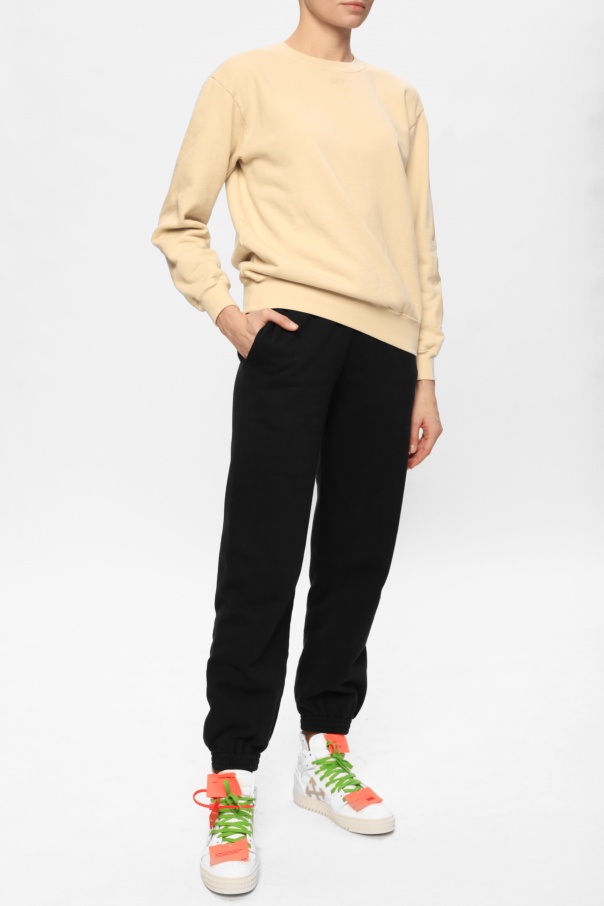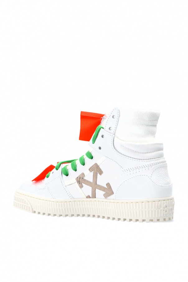 White and red ‘3.0 Off Court’ sneakers from Off-White. Boasting the brand's signature red zip tie tag, this high-top pair sits on a cream rubber and features leather-crafted upper with lace-up front, perforated details, a logo graphic print and neon orange patches.