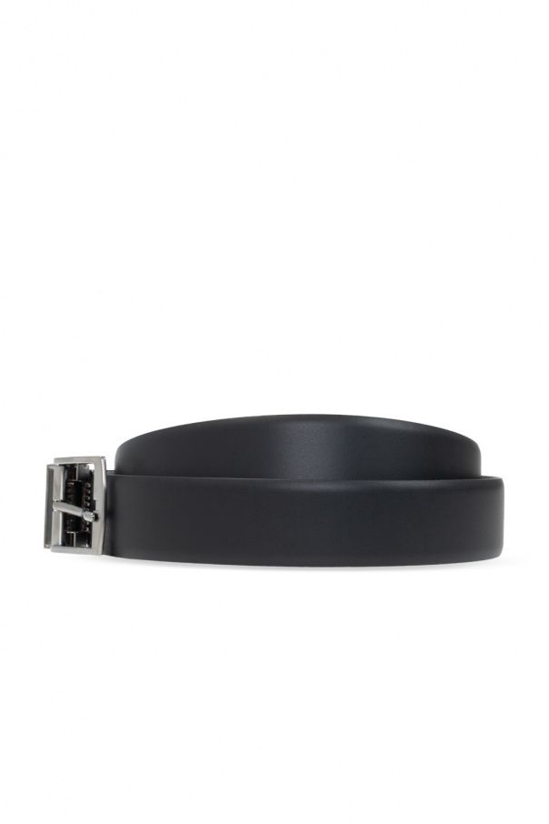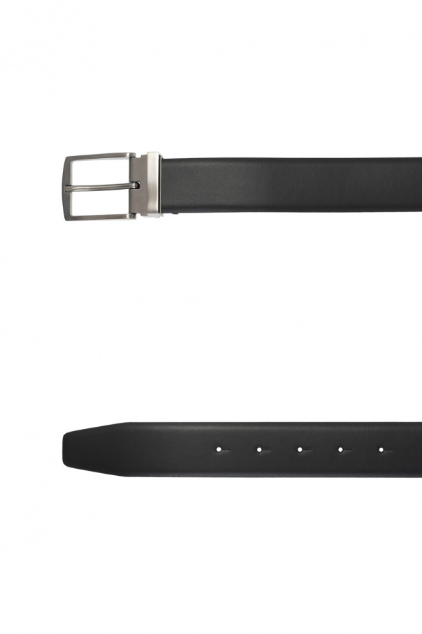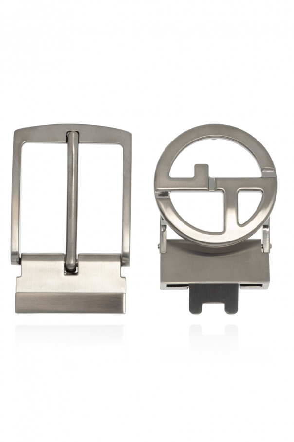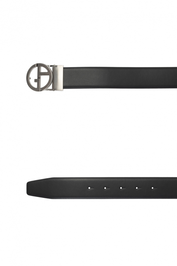 Black belt from Giorgio Armani. Made of leather, this item features a silver-tone buckle and an exchangeable logo-embossed buckle.
