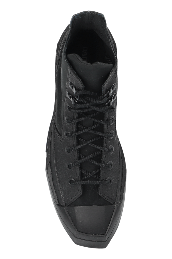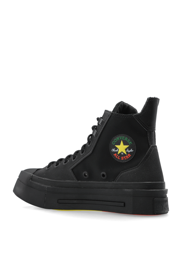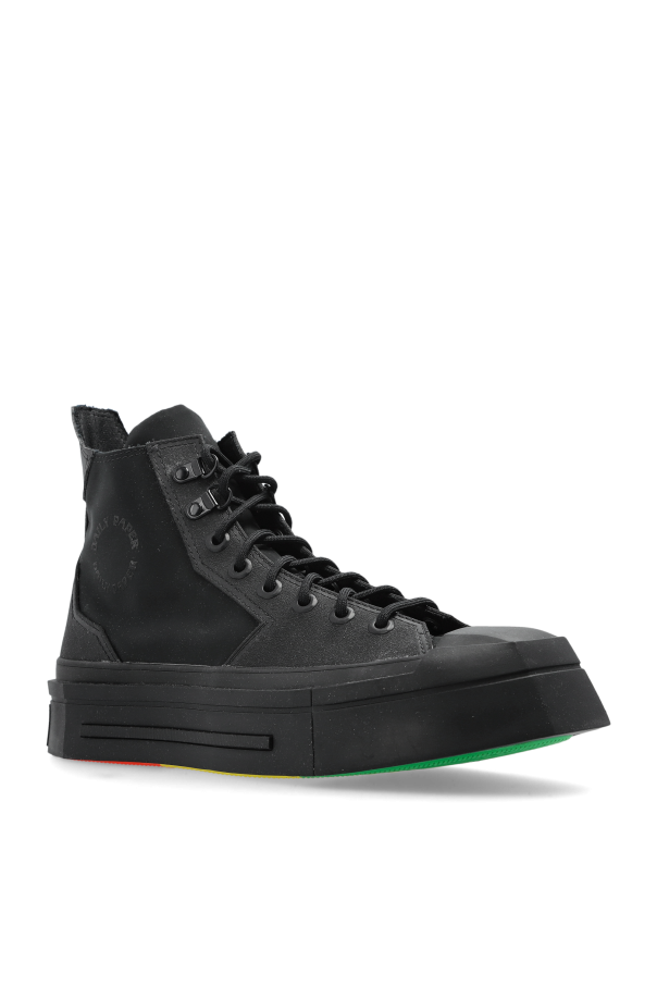 Introducing the Converse X Daily Paper, a pair of exquisite black high-top sneakers that seamlessly blend classic design with a modern edge. Crafted from durable materials, these sneakers boast a timeless silhouette with a high collar for enhanced support. The distinctive design features embossed \"DAILY PAPER\" lettering alongside the iconic \"Converse All Star\" logo, adorned with a vibrant yellow star and a green-red border. A robust black sole, accented with hues of green, yellow, and red, adds a touch of playful sophistication. Complemented by classic black laces, these sneakers are the epitome of minimalist elegance, effortlessly versatile for any ensemble. Perfect for the streetwear aficionado, they embody the quintessential Converse style with a contemporary twist. Why Choose This Product? Timeless high-top silhouette with modern detailing Durable construction for everyday wear Striking design elements with vibrant color accents Versatile style suitable for various occasions