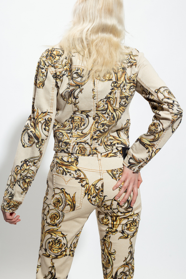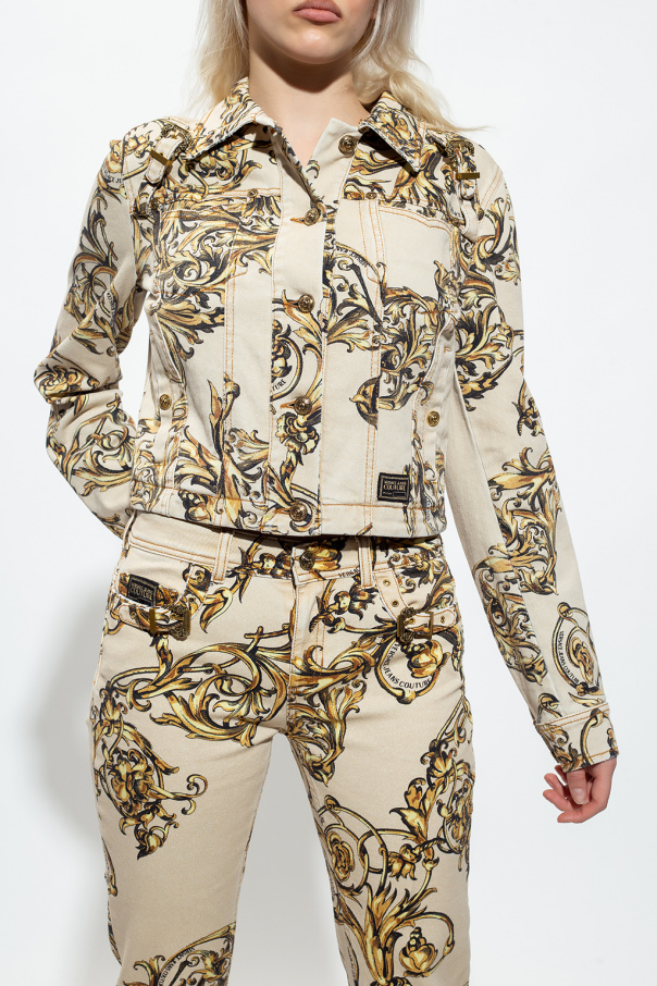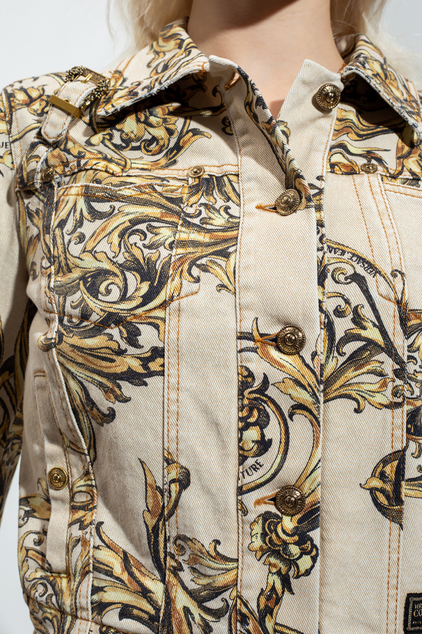 Light beige denim jacket from Versace Jeans Couture. Embellished with the brand's iconic yellow-orange-black Barocco print, this style features button fastenings, decorative buckle straps, four frontal pockets (including two snap-fastened ones), long sleeves with button cuffs, an elasticated hem and gold-tone metal hardware with an embossed logo.