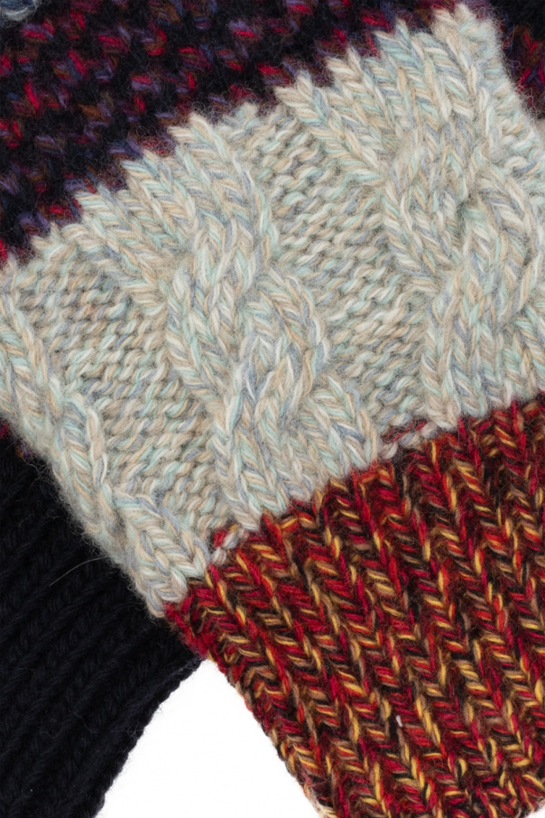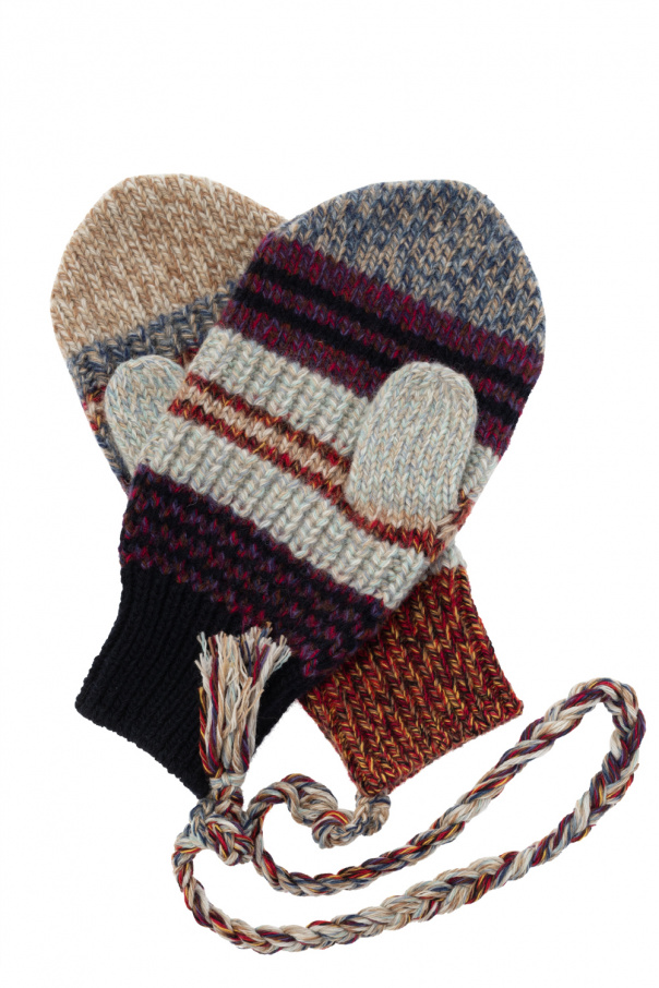 Multicolored striped mittens with a string and ribbed trims from Nick Fouquet x Federico Curradi. Made of a wool and cashmere blend.
