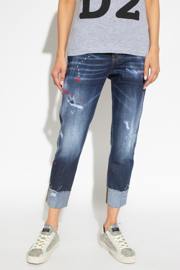 Navy blue ‘Cool Girl Cropped’ jeans from Dsquared2. Made of cotton, this pair falls with slightly tapered legs and features button fastenings, paint splatters, stitching details and a distressed treatment. It is complete with button fastenings, classic five pockets, rolled cuffs and a beige patch with an embossed logo at the back.