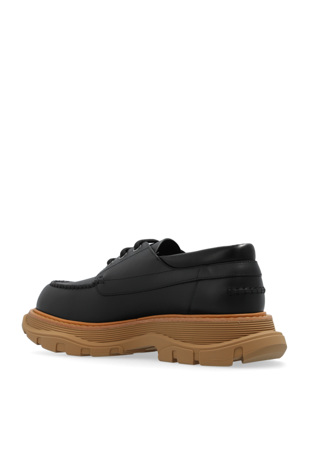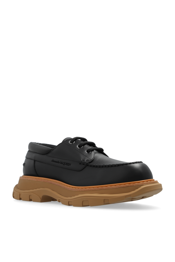 Introducing the quintessence of modern sophistication, the Alexander McQueen Lace-Up Platform Shoes. These exquisite pieces are a testament to timeless style fused with contemporary edge. Crafted from the finest calfskin leather, both inside and out, these shoes offer unparalleled comfort and durability. The distinctive feature of these shoes is their two-tone platform sole, with a striking contrast between the light brown rubber base and the sleek black upper sole that seamlessly blends with the black leather upper. The platform\'s medium height not only elevates your stature but also ensures day-long comfort. Traditional black laces thread through the upper, offering a classic touch to the modern design, while the rounded toe preserves a sense of tradition amidst the novelty. Accented with a subtle designer logo on the side, these shoes carry the signature of Alexander McQueen\'s innovative spirit. The additional set of colorful laces included allows for personal customization, making each pair truly unique. Why Purchase This Product? Elegance and comfort combined, thanks to the high-quality calfskin leather and rubber platform sole. Unique two-tone design offering a modern twist on classic lace-up shoes. Versatile style that complements both formal attire and casual outfits. Customizable appearance with the inclusion of colorful laces to match your personal style.
