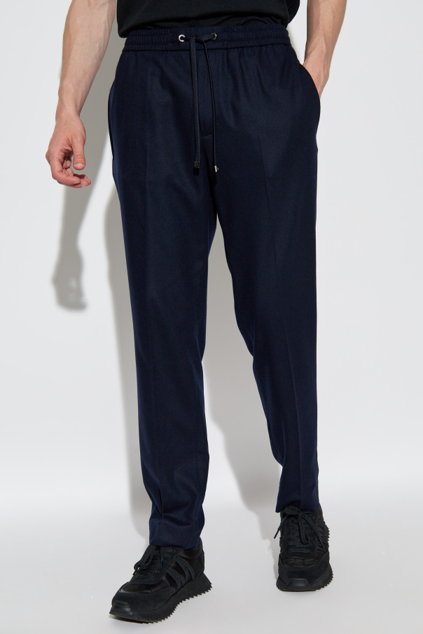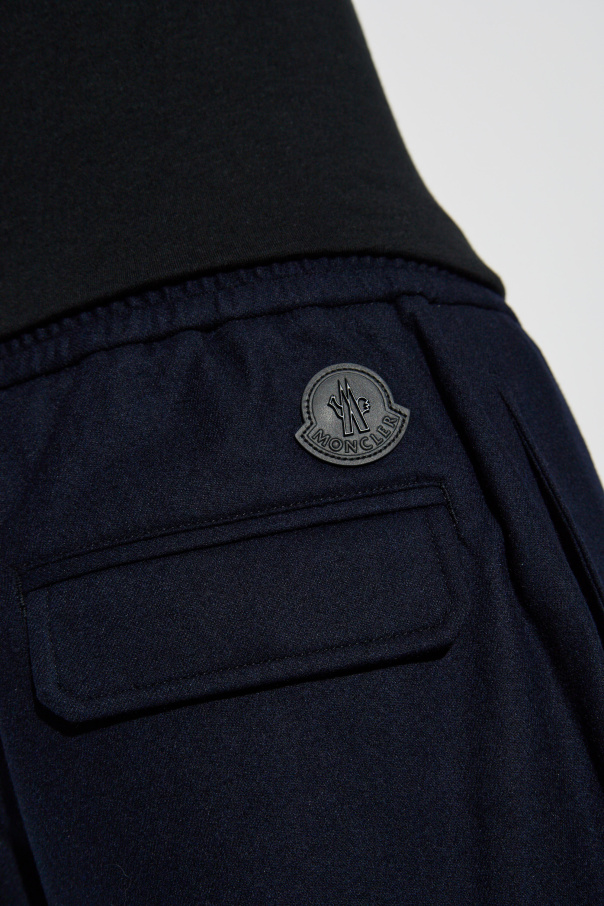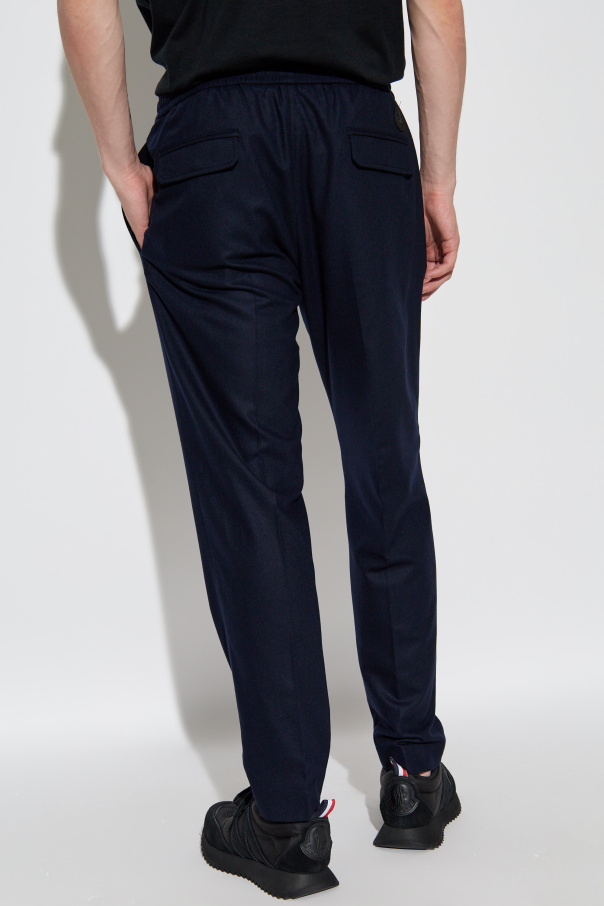 Introducing the epitome of sartorial elegance with a touch of modern versatility - the Navy Pleated Trousers by the renowned designer Moncler. Crafted from an exquisite blend of polyamide and cashmere, these trousers offer an unparalleled combination of comfort and luxury. Featuring a classic, straight leg cut with sharply creased pleats, these trousers exude sophistication. The elastic waistband, complemented by an external drawstring, ensures a custom fit, catering to the silhouette of the wearer. Practicality is woven into the design with discreetly placed pockets, including side pockets with a nearly invisible seam and rear flap pockets, one of which is embellished with Moncler\'s subtle, yet distinguishable logo, marking the authenticity and craftsmanship of the brand. The deep navy hue renders these trousers a versatile choice, seamlessly blending with both formal and casual ensembles. The smooth fabric not only looks refined but feels exceptionally comfortable against the skin, making these trousers a perfect blend of elegance and ease. Why Purchase This Product? Expertly tailored by Moncler, a symbol of luxury and quality. Combines elegance with comfort, thanks to the high-quality blend of polyamide and cashmere. Adjustable waist with drawstrings offers a perfect fit. Universal navy color enhances wardrobe versatility. Unique design details like the discreet logo and invisible-seam pockets add an exclusive touch.