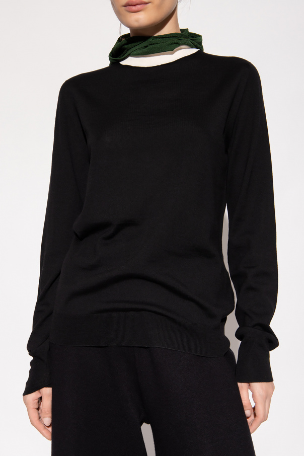 Black sweater from Jil Sander+. Crafted from a wool and silk blend, this style features a white ribbed standing collar with a dark green hood, long sleeves and elasticized trims on the bottom hem and cuffs.