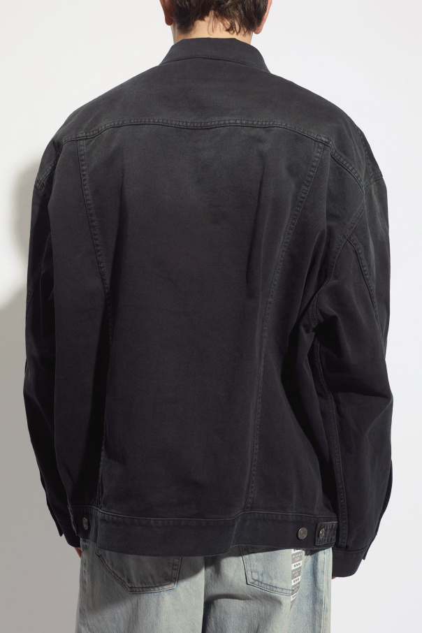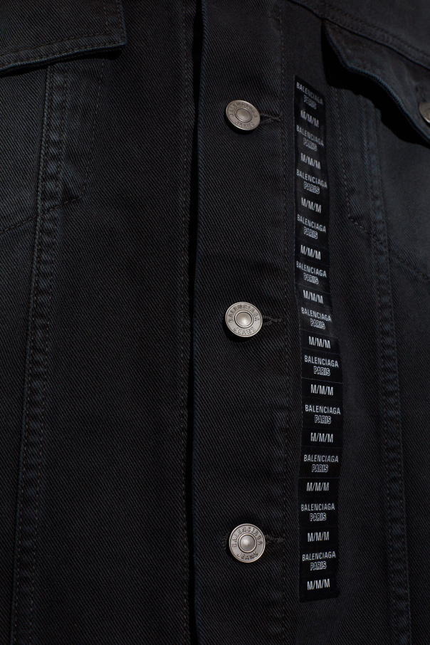 Black oversize denim jacket from Balenciaga. Fastened with buttons, this design features a printed size sticker, collar, two slip pockets, two flap pockets and long sleeves with buttoned cuffs.