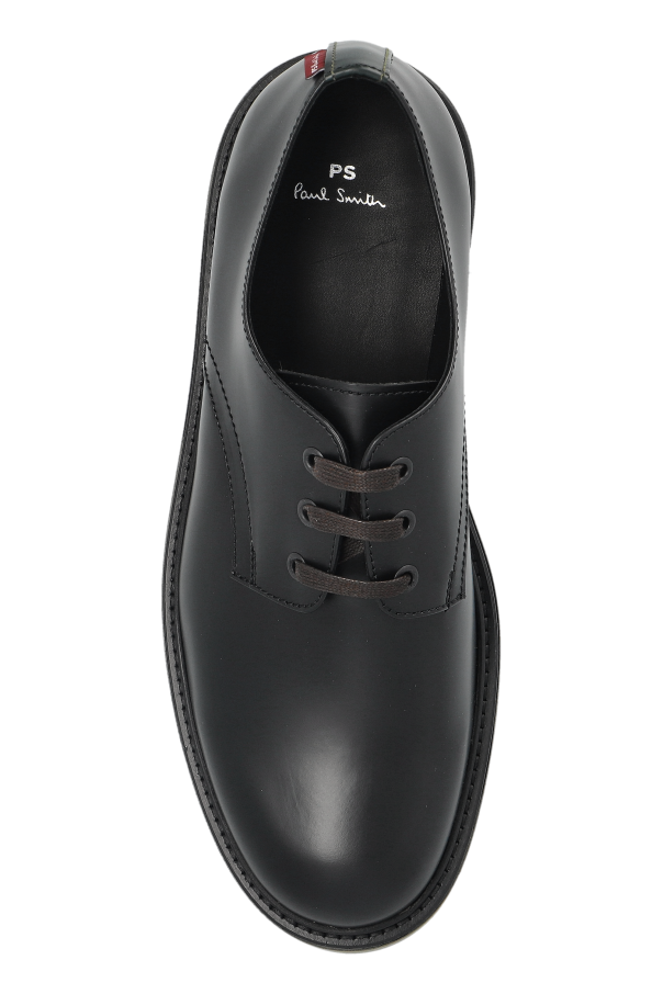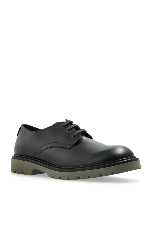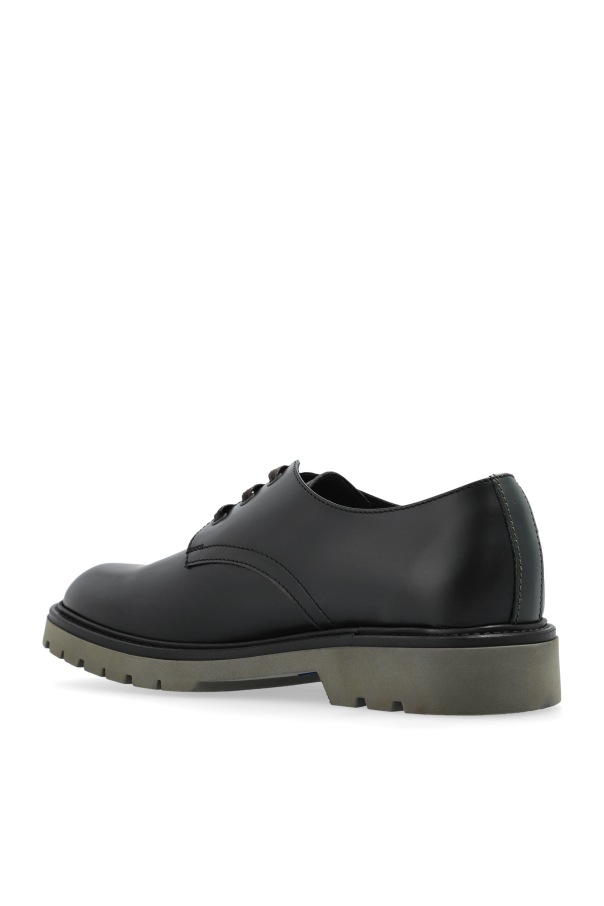 Introducing the Jango Leather Shoes by PS Paul Smith – a quintessential blend of classic elegance and modern flair. These men\'s derby shoes boast a timeless design with a rounded toe and four-eyelet lacing, crafted from premium black leather. The robust, olive-hued rubber sole offers impeccable grip, ensuring comfort and stability with every step. A subtle, colorful ribbon graces the back of the heel, adding a touch of distinction and playful charm. Inside, the prestigious \"PS Paul Smith\" logo is a testament to the shoe\'s authenticity and heritage. Why Choose This Product? Exquisite craftsmanship with 100% leather exterior and interior for lasting durability. Versatile elegance suitable for both formal and semi-formal occasions. Signature design featuring a unique colorful ribbon detail. Exceptional grip with a 100% rubber sole.