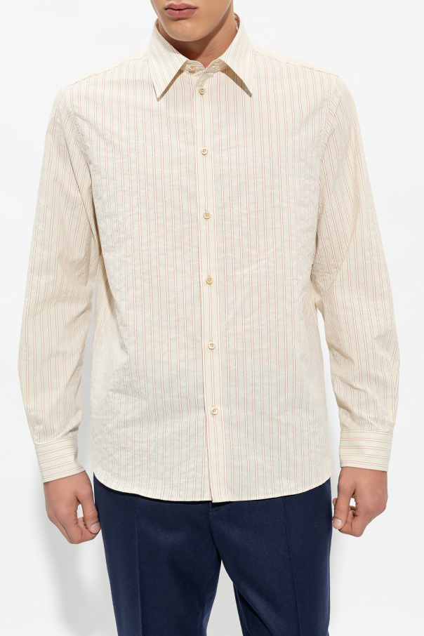 Cream shirt from Gucci. Crafted from cotton, this style showcases a white and red stripe pattern, front button fastenings and long sleeves with button cuffs.