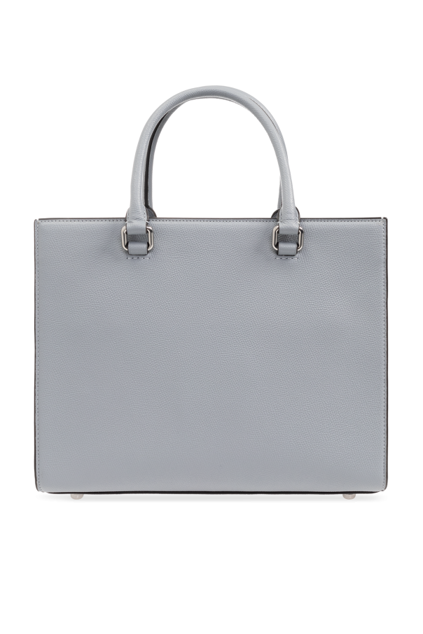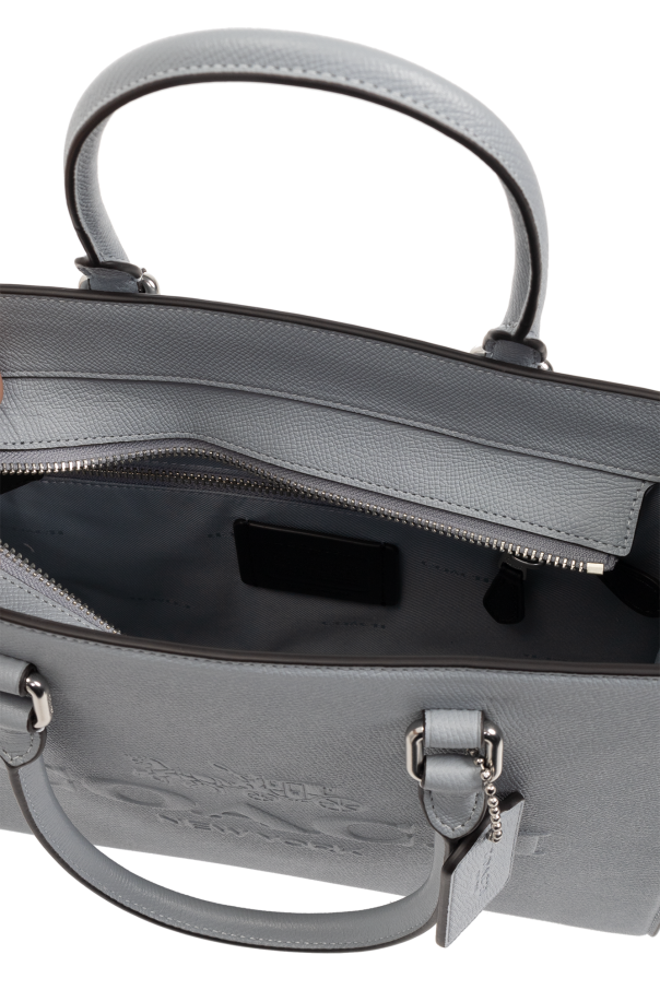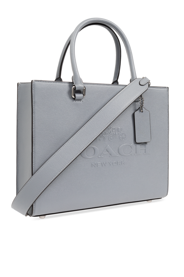 Light blue shopper bag from Coach. Made of leather, this design fastens via a zip and features a raised logo on the front, two half-round handles, two detachable and adjustable shoulder straps, silver-tone metal hardware and one internal compartment with one zip pocket and two slip pockets.