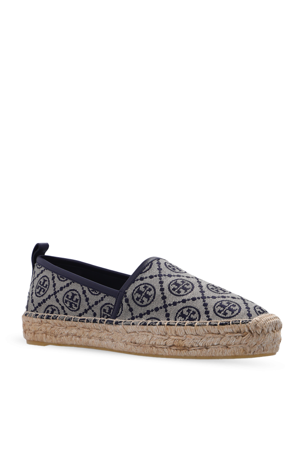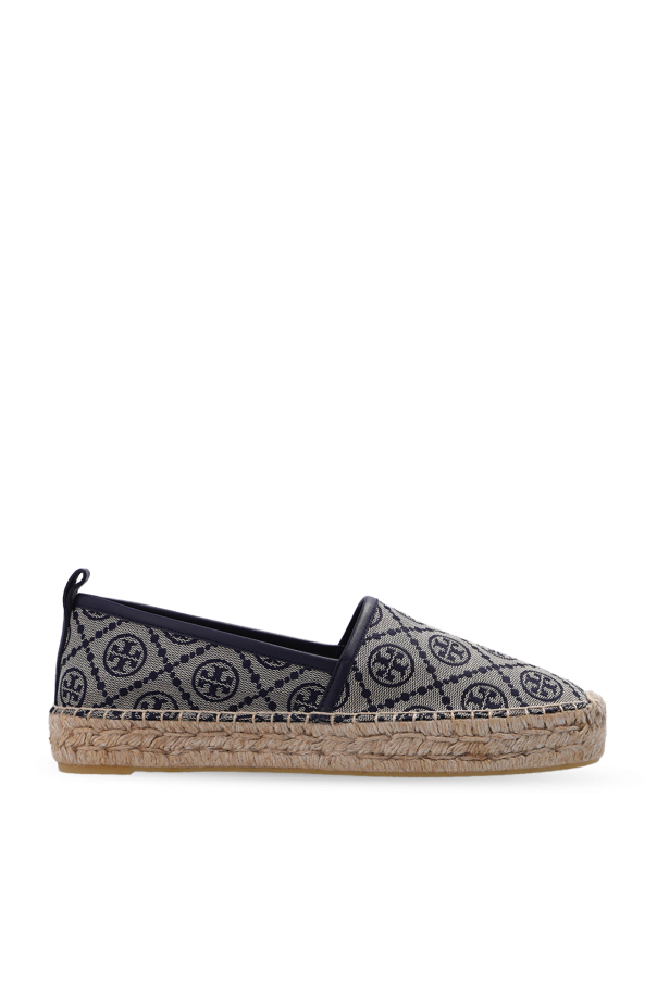 Beige and navy blue espadrilles from Tory Burch. Crafted from monogrammed fabric and trimmed with leather piping, this model features a rubber sole with a beige jute overlay.